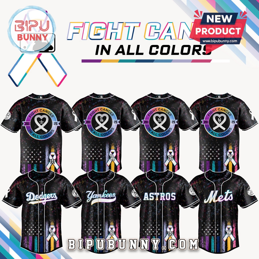 The MLB x Fight Cancer In All Colors 2025 Jersey brings together sports passion and purpose in one bold design. This limited-edition jersey features a deep black background splattered with colorful paint patterns, symbolizing the unity of all cancer types. On the front, each jersey displays the official logo of your favorite MLB team—Dodgers, Yankees, Mets, Astros, and more—styled with soft rainbow gradients that add subtle vibrancy. The base fabric is lightweight, breathable polyester, giving it a soft touch while keeping you cool and dry.