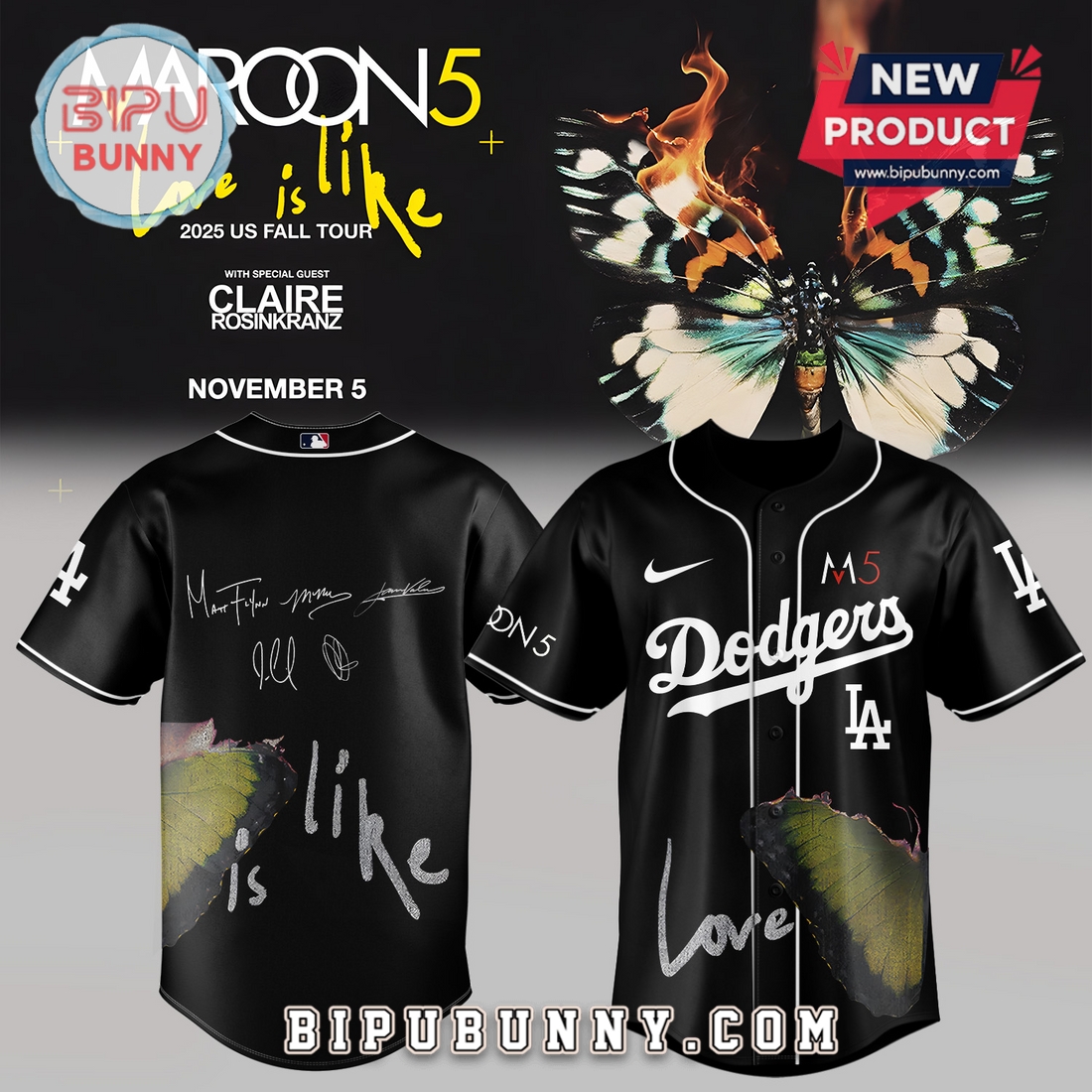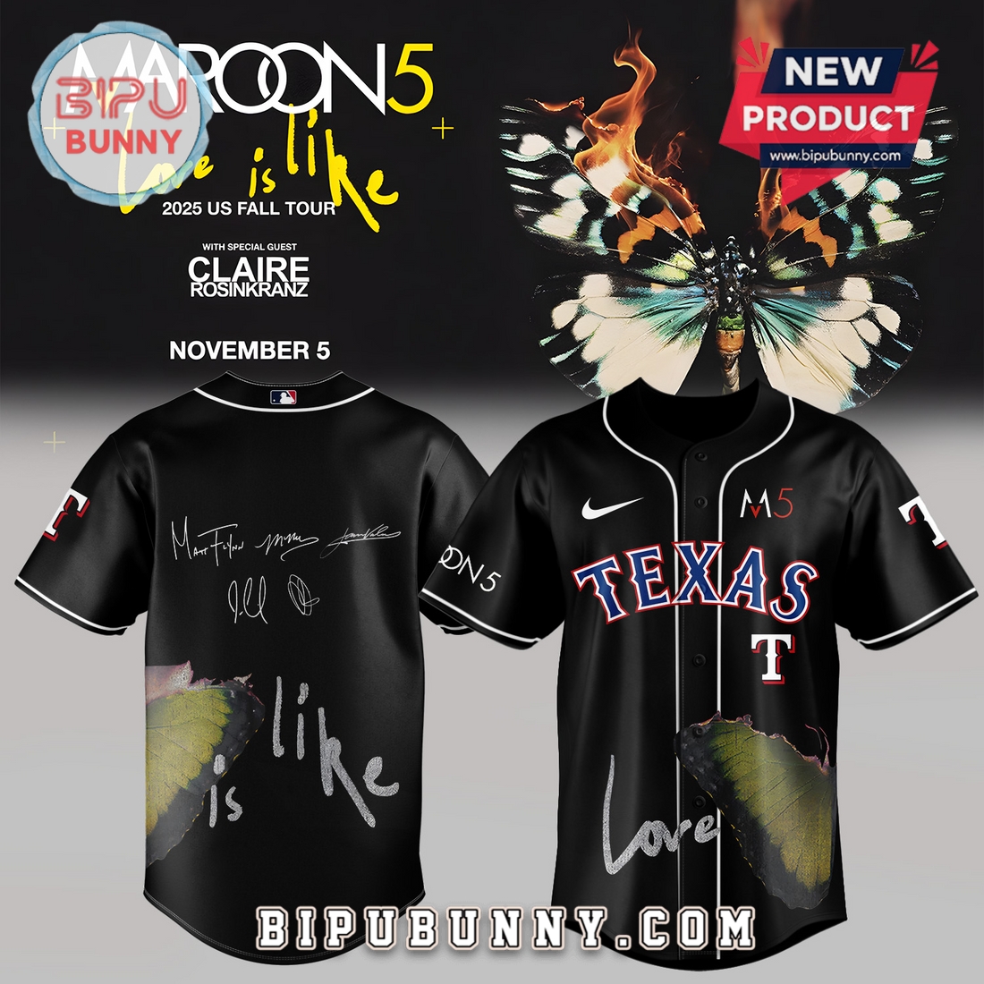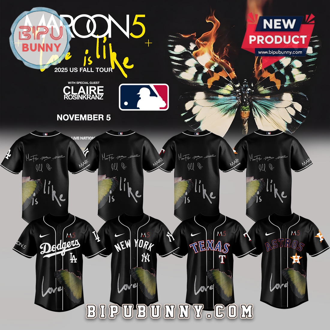 The front of the jersey is where your baseball pride shines. You can pick from four different versions, each featuring the logo of a classic MLB team: the New York Yankees, Los Angeles Dodgers, Houston Astros, and Texas Rangers. Beneath the team name, the word “Love” is written in a handwritten font, sitting next to a cool graphic of a butterfly. This design is inspired by the band’s “Love Is Like” tour. The back of the jersey features a full-size version of that same handwritten text, along with a replica of Adam Levine’s signature. This detail makes the jersey feel personal and authentic. With a full button-up front and a small MLB logo on the back collar, this jersey has all the classic elements you love. It’s a great way to wear your passion for both Maroon 5 and your favorite team.