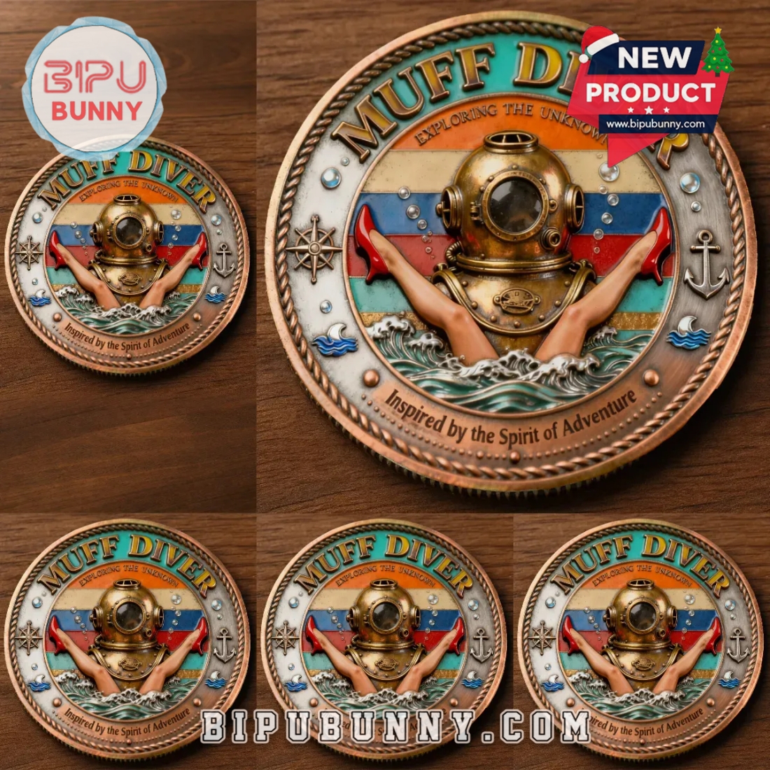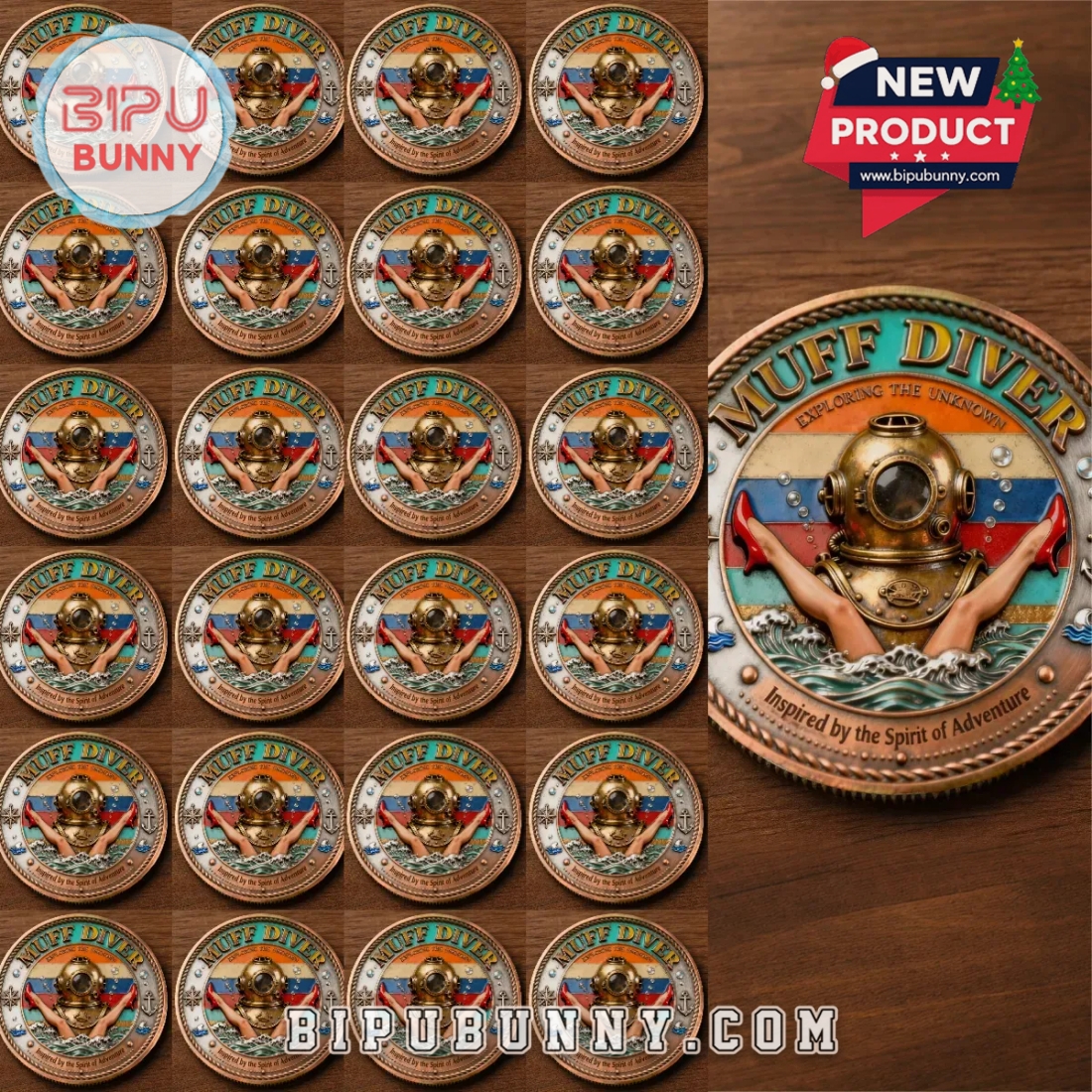 The Muff Diver Commemorative Coin is a striking metal collectible designed for people who enjoy bold art strong themes and high attention to detail. The coin features a warm antique copper and gold tone base combined with rich enamel colors including teal blue deep orange cream and navy accents. At the center sits a classic deep sea diving helmet rendered in high relief giving the coin depth and a solid visual focus. Surrounding the helmet are layered ocean waves bubbles and small nautical elements such as anchors compass symbols and shells placed evenly around the surface. Raised lettering curves cleanly along the top and bottom edges while a twisted rope style border frames the entire coin. The metal body has a smooth weighty feel with finely polished edges that are comfortable to hold. This commemorative coin works well as a display piece a desk companion a pocket carry item or a unique gift for collectors who enjoy maritime and vintage inspired designs. Some versions are offered in different sizes allowing collectors to choose between a compact carry coin or a larger display focused piece.