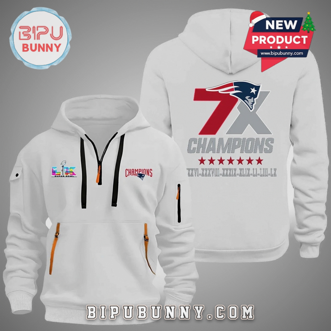 The New England Patriots 7X Champions Super Bowl Half-Zip Hoodie stands as a definitive declaration of loyalty and an unparalleled tribute to a dynasty’s historic achievements. This garment is far more than just another piece of fan apparel; it is a wearable trophy, a comfortable homage to seven Super Bowl victories that cemented the Patriots’ place in NFL history. Constructed from a premium, mid-weight fleece blend, this hoodie offers an immediate sense of plush comfort and warmth, designed to keep fans cozy whether they’re enduring a chilly game day at Gillette Stadium, gathering for a watch party, or simply enjoying a relaxed evening at home. The fabric blend, typically a mix of cotton and polyester, strikes an ideal balance between softness against the skin and durable resilience, ensuring the hoodie maintains its shape and vibrant colors through countless washes and wears, making it a long-lasting staple in any Patriots enthusiast’s wardrobe.