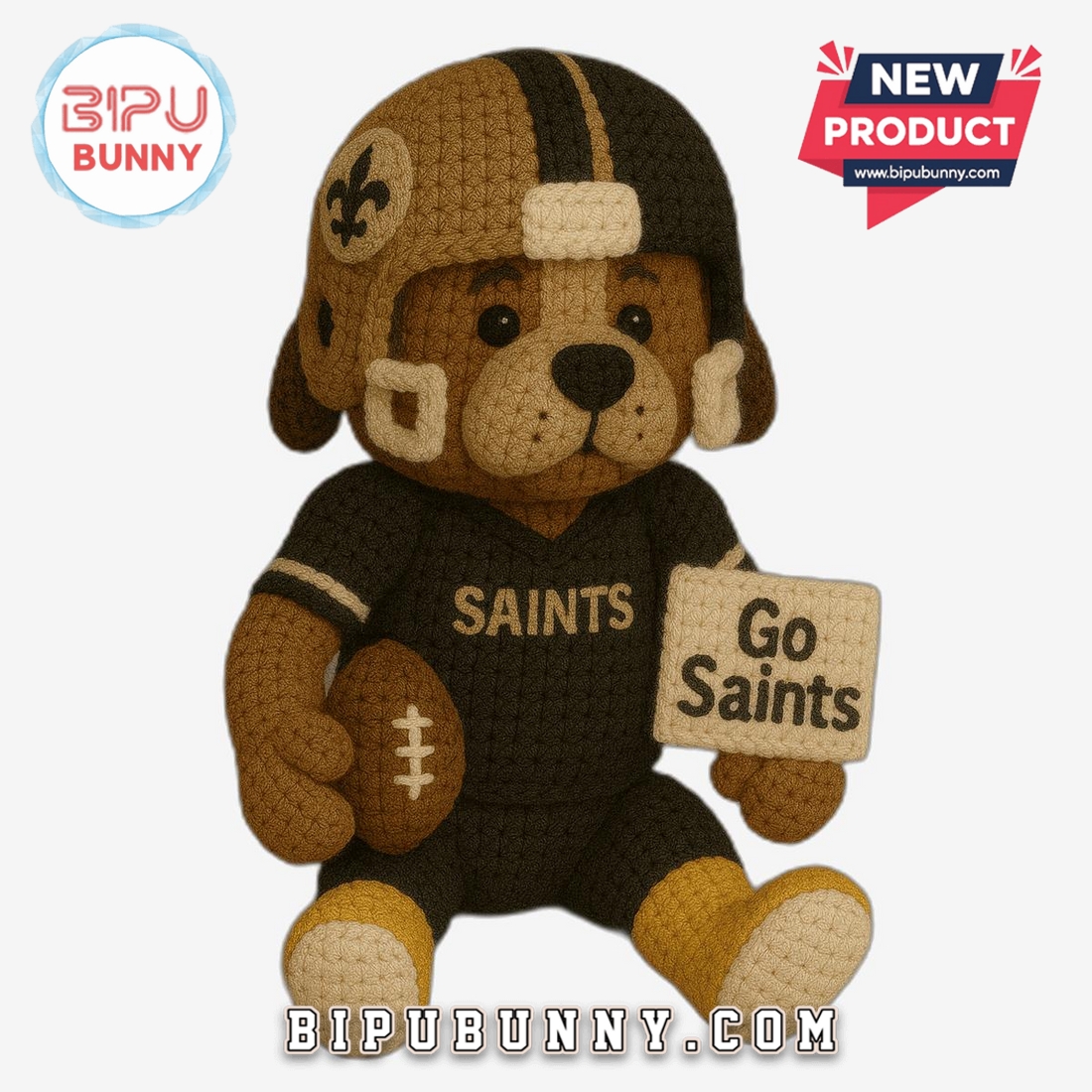 This special crochet doll is made for any Saints supporter! It is a great gift for the devoted fan in your life! The doll is a perfect reminder of your team spirit! When you hold this doll you feel a sense of comfort and joy! This doll stands out because of its detailed uniform, tiny football and sign, and unique handmade quality! Its charming design and soft texture make it a great item for anyone! This little buddy is easy to take care of! A gentle hand wash with cold water and mild soap is all it needs to stay clean and in perfect condition! Pair it with other Saints merchandise like a hat or a t-shirt to complete your fan collection! This doll is made by BIPU BUNNY! a brand known for creating wonderful and unique crochet products! Every piece is made with care and a love for the details!