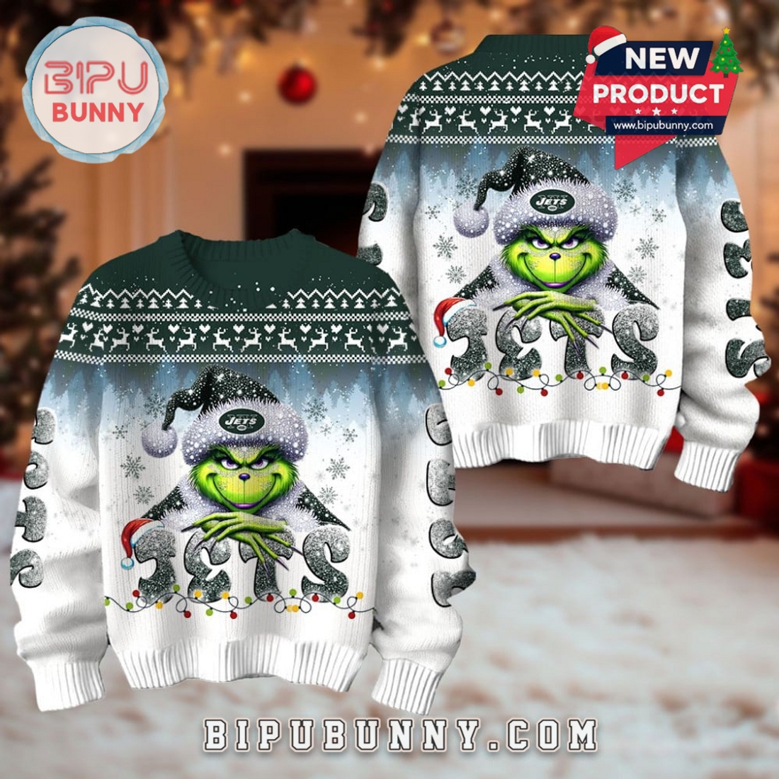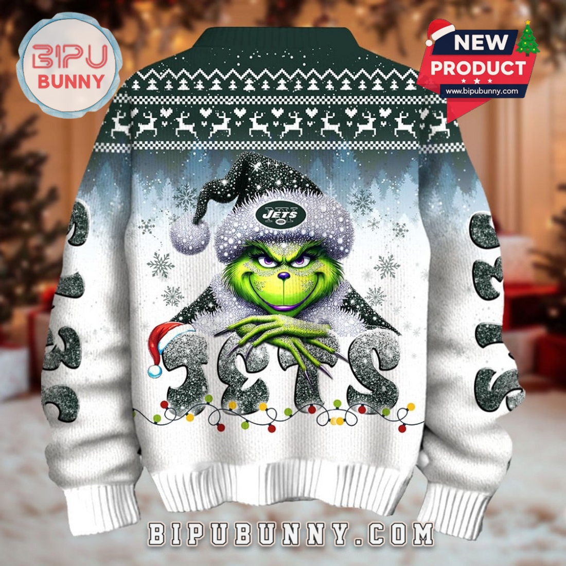 The sweater starts with a rich forest green upper section, fading smoothly into a clean white base. Across the chest, the iconic Grinch character takes center stage, wearing a fluffy Santa hat proudly marked with the official New York Jets logo. Beneath his grin, the word “JETS” appears in oversized, glitter-style block letters that shimmer under light. A playful string of colorful holiday bulbs wraps along the bottom of the graphic, adding just the right amount of fun.