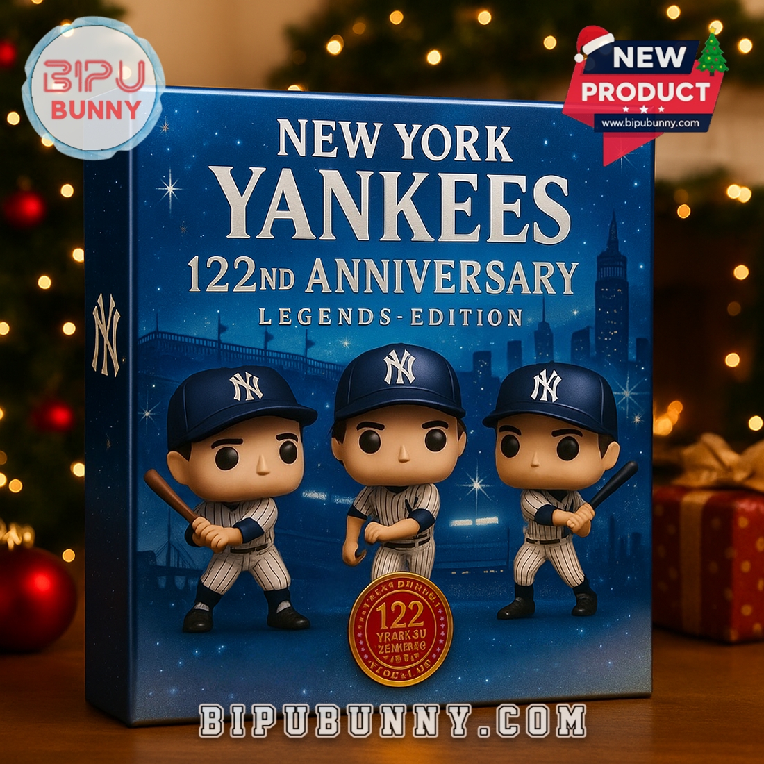 The box design captures the majesty of the Bronx Bombers. It features the classic team colors of navy blue and white, with the iconic New York Yankees text boldly displayed across the front. The artwork showcases three stylized Yankees players in their famous pinstripe uniforms standing in front of a starry night view of Yankee Stadium. A commemorative 122nd Anniversary seal adds an extra layer of collector value. The subtle snowfall effect and sparkling text give the box a festive, championship feel.