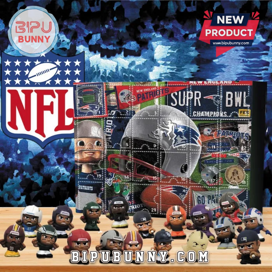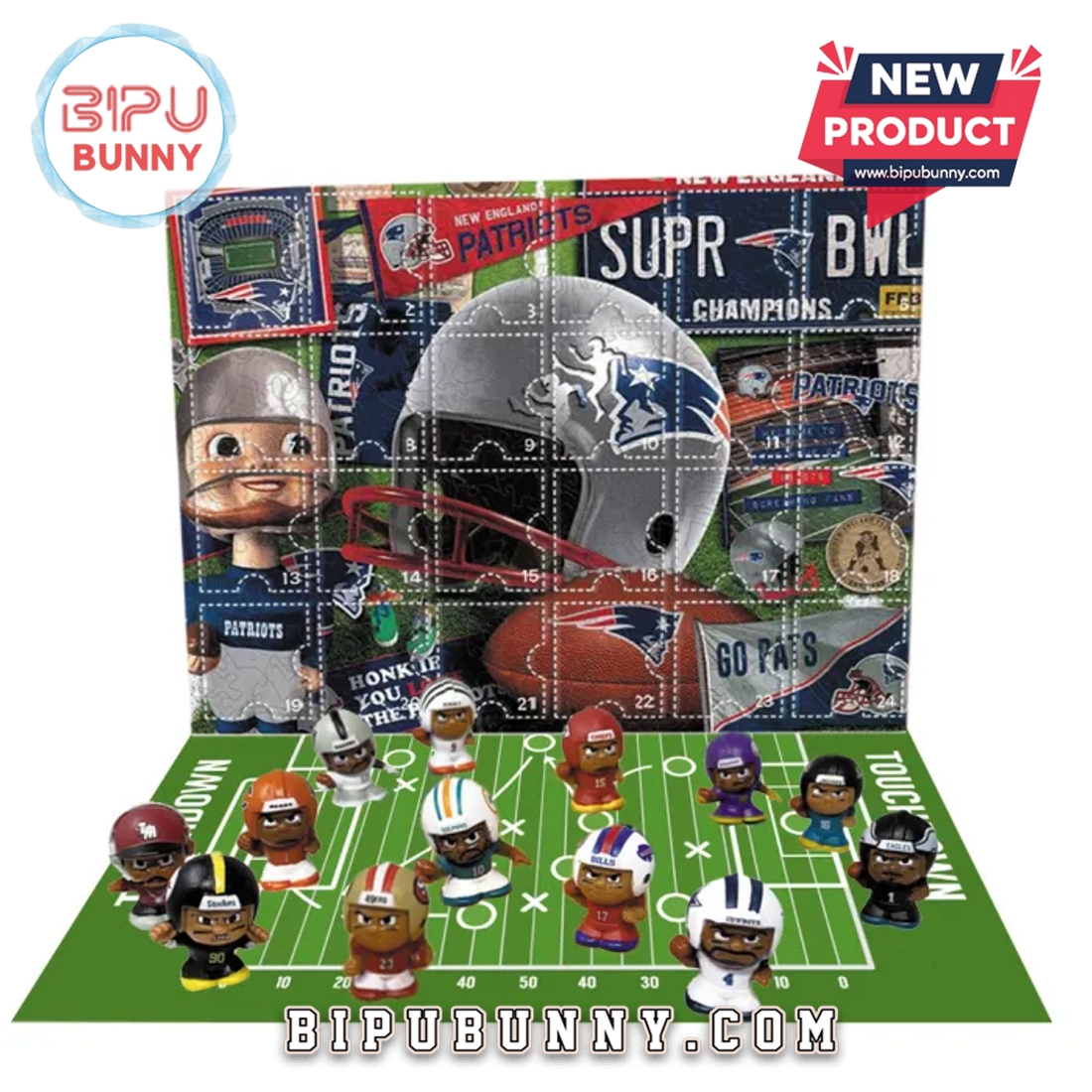 The NFL Super Bowl Champions Advent Calendar 2025 is made for fans who live and breathe football. The design is bold and electric, featuring the New England Patriots as the spotlight team, with a background of NFL logos, vintage game tickets, and championship graphics. Each of the 24 numbered doors is built into a glossy, full-color stadium-style display, centered around a large Patriots helmet and football. The entire structure is printed on thick, durable cardboard with a reinforced fold-out base that opens to reveal a miniature football field—perfect for arranging the surprise figures inside.