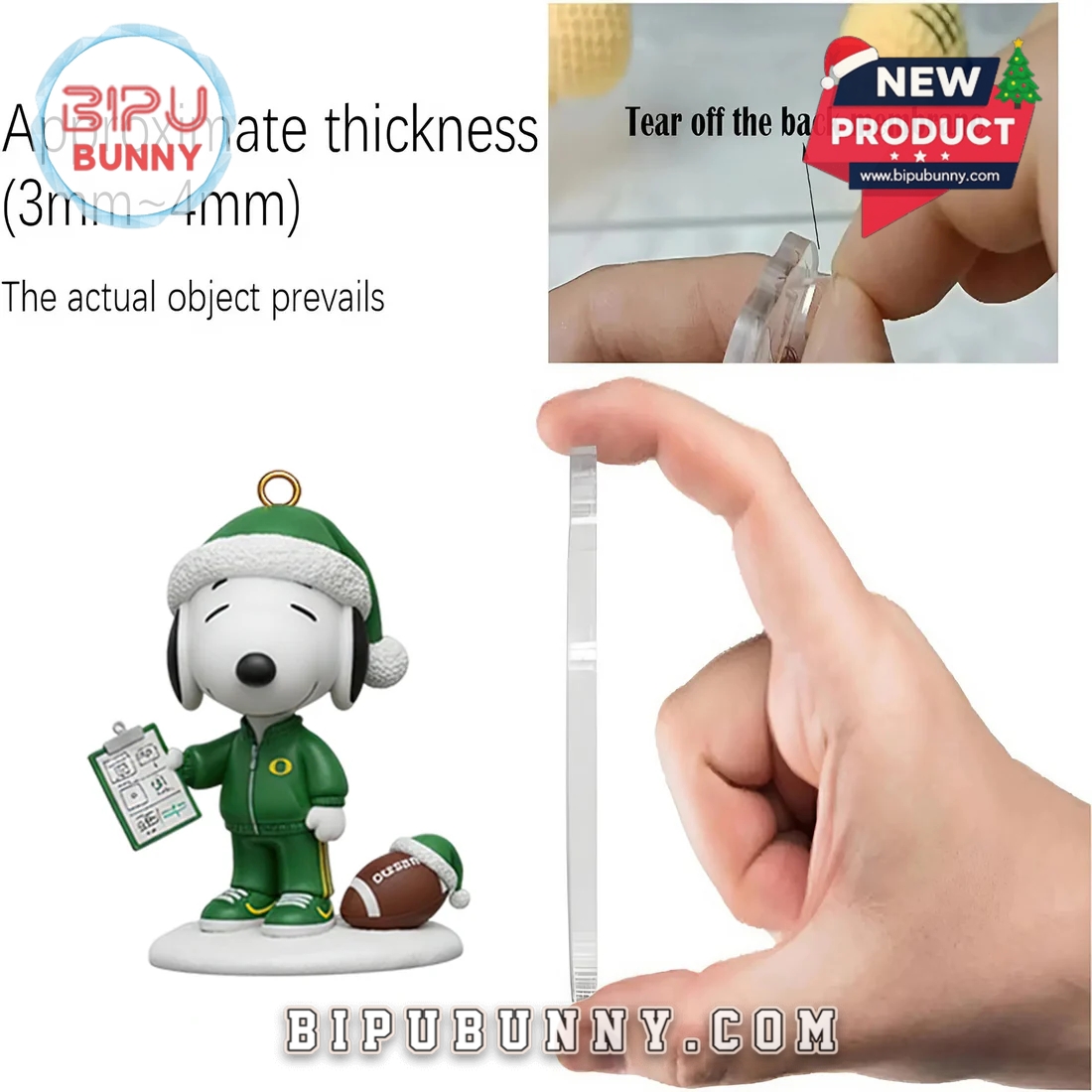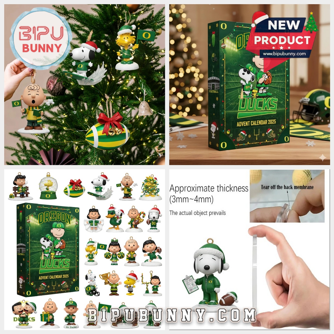 Inside, the calendar includes 24 individual compartments, each hiding a Peanuts-themed ornament or mini-figure celebrating both Christmas and Ducks football. These decorations include fan favorites like Snoopy surfing in a Santa hat, Charlie Brown waving a team flag, Woodstock in a referee uniform, and football-shaped ornaments with bows. The pieces are made from smooth acrylic or durable plastic, approximately 3mm to 4mm thick, with a glossy finish and clear detailing. Each ornament has a hanging loop, so they’re ready for your tree, mantel, or even to use as gift tags.