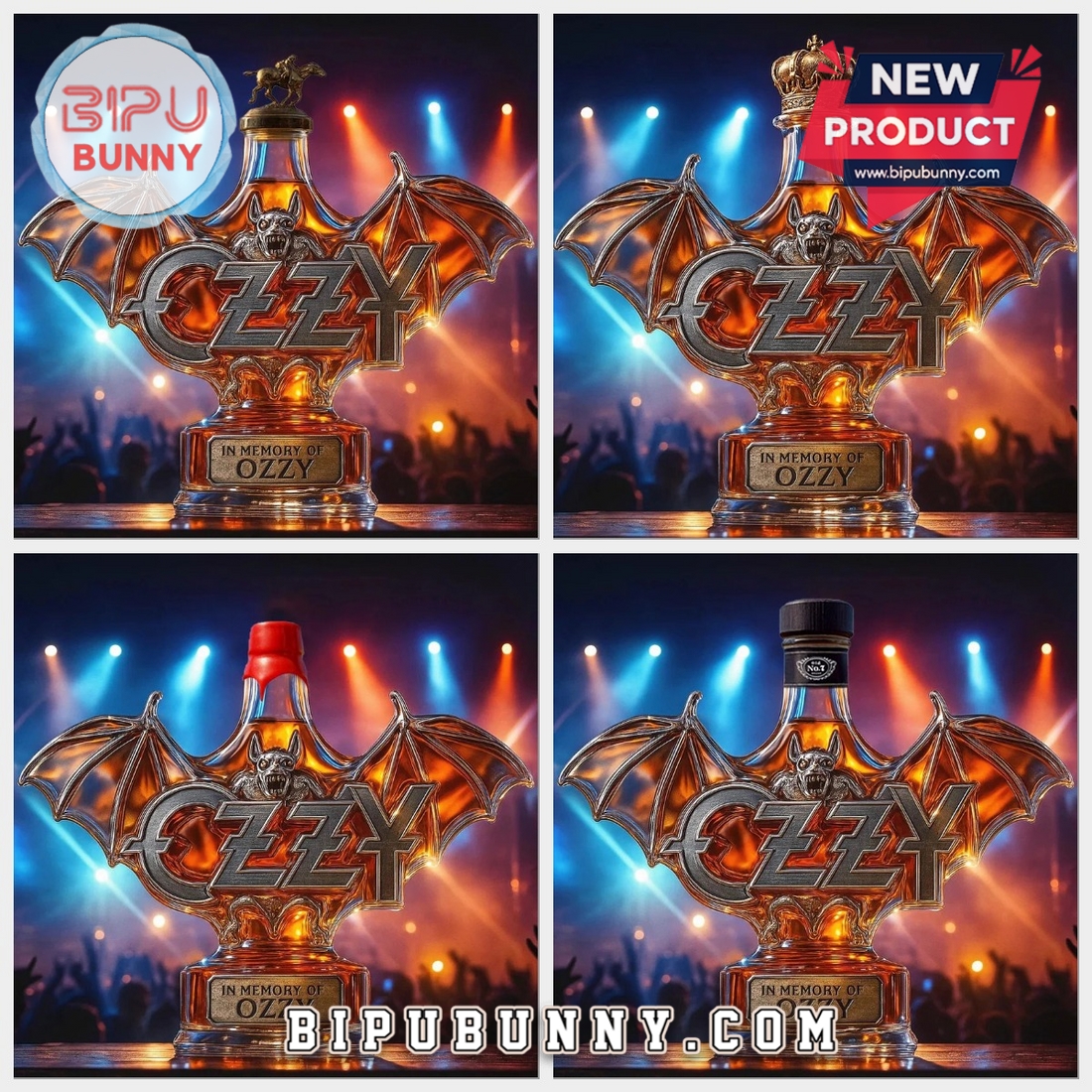 The Ozzy Osbourne Legend Whiskey Bottle is an exceptional collector’s item designed to honor the legendary rock star. This beautifully crafted bottle features intricate details, with a bold design that pays homage to Ozzy’s iconic bat wings. The bottle is made of high-quality glass with a golden amber hue, resembling the warmth of fine whiskey. It stands out with its bat wings design, perfectly sculpted on both sides, and a striking metallic “Ozzy” logo that catches the light from every angle. The “In Memory of Ozzy” engraving on the base adds a personal and emotional touch, further cementing its tribute nature.