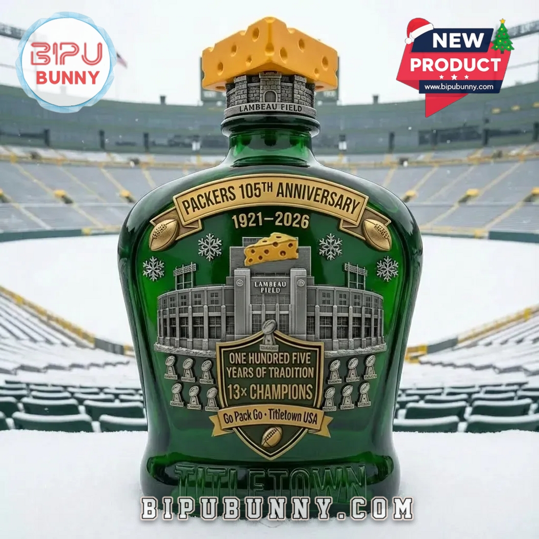 The Packers 105th Anniversary Whiskey Decanter is a beautifully designed tribute to the Green Bay Packers’ rich history and storied tradition. Made from high-quality glass, this decanter features an elegant green and gold color scheme, reflecting the team’s iconic colors. The design is meticulously detailed, showcasing the Lambeau Field stadium on the front, along with a golden cheesehead atop the bottle, symbolizing the pride of the Packers Nation. This decanter not only serves as a functional whiskey bottle but also as a commemorative piece that highlights the team’s 13 NFL Championships and 105 years of tradition.