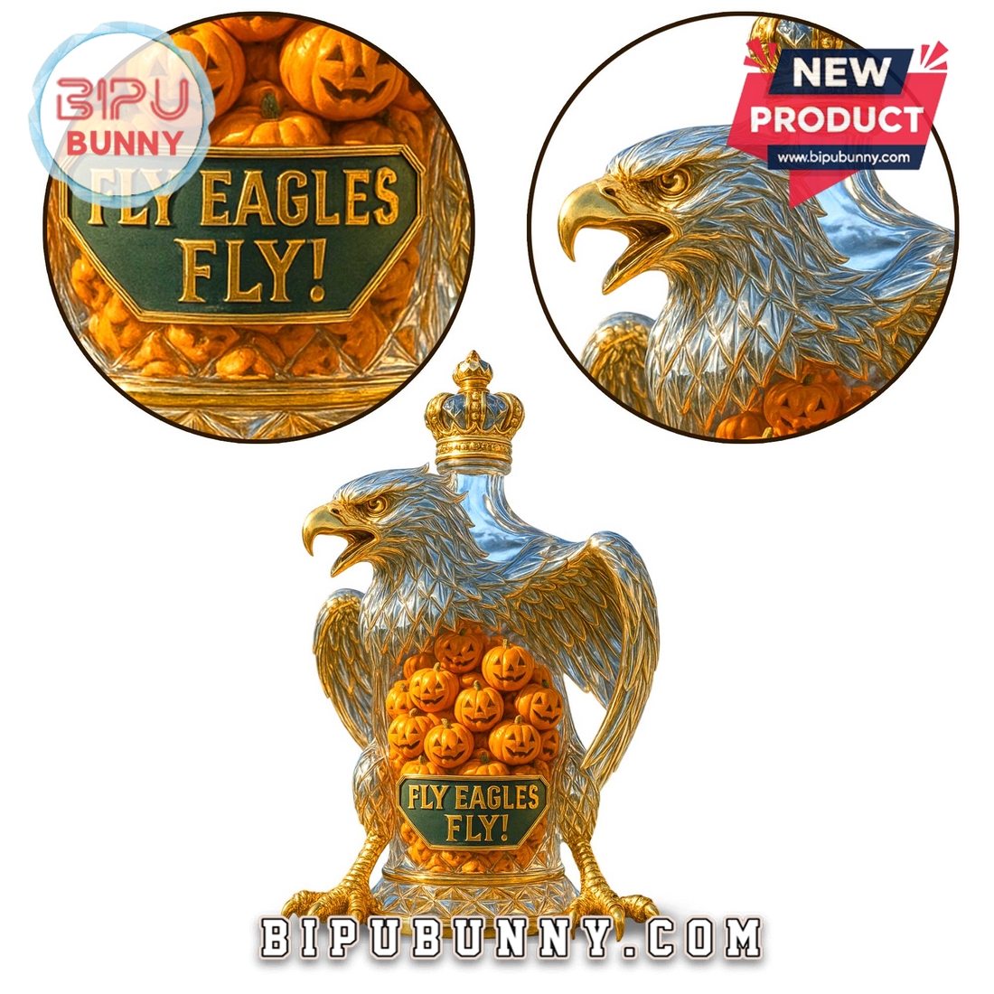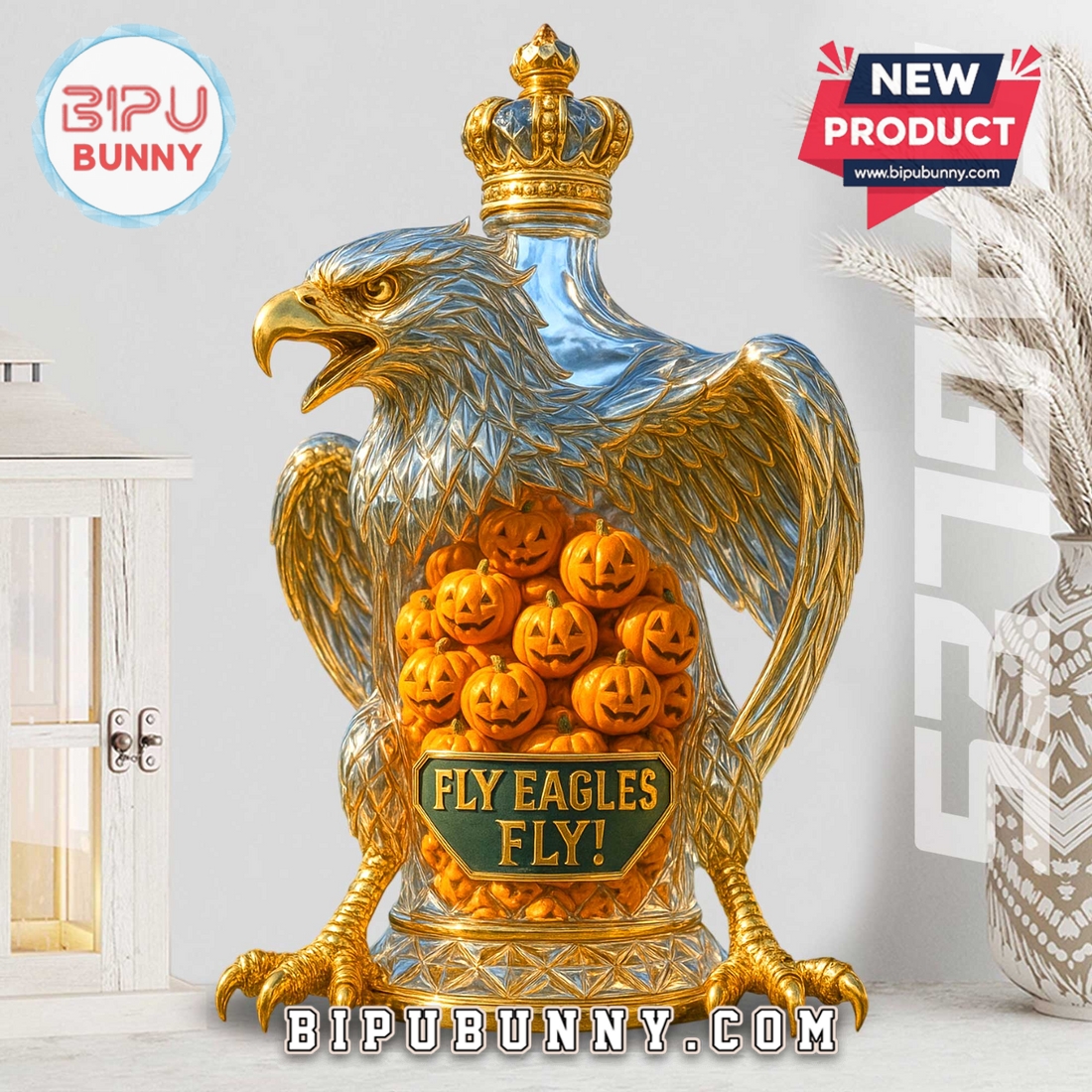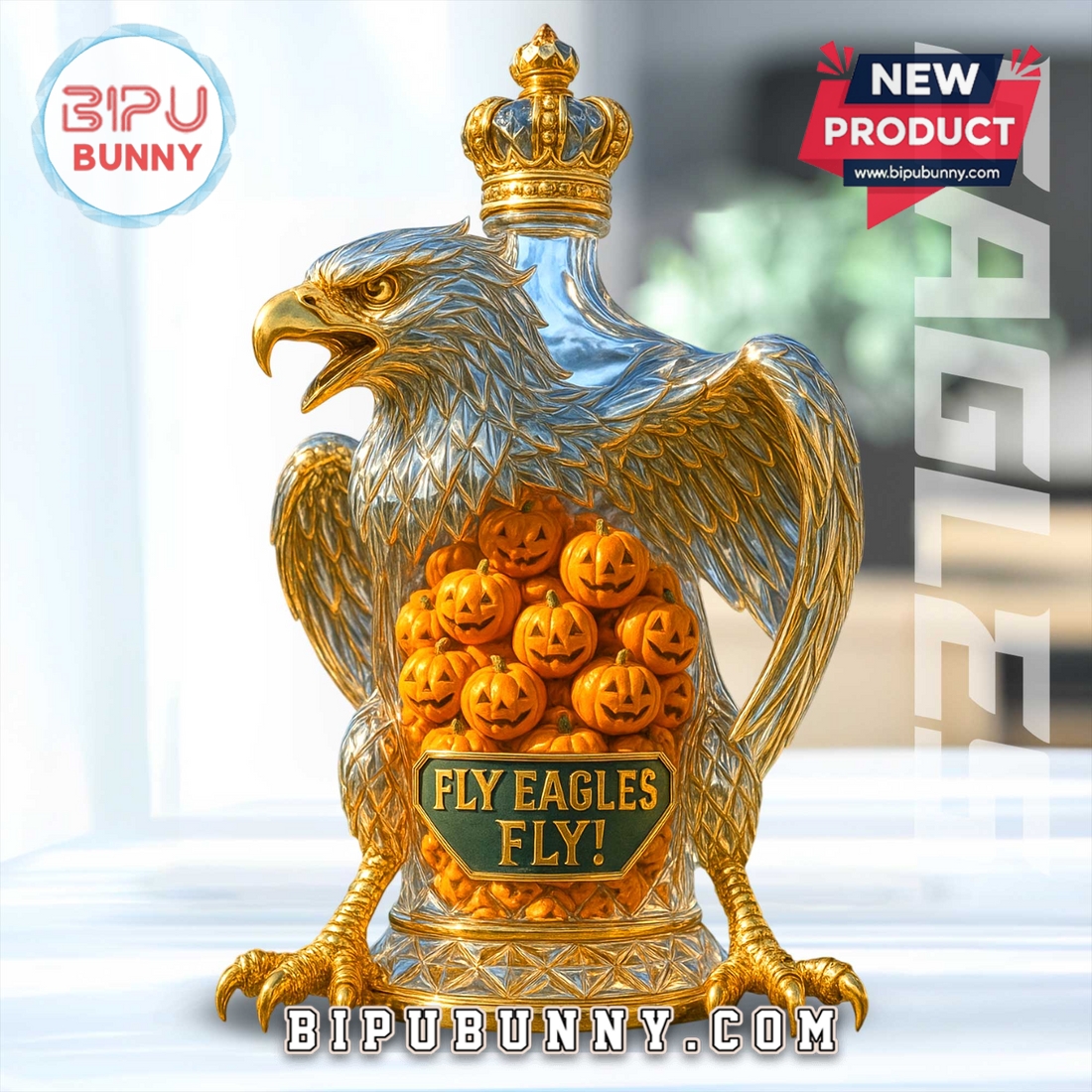 Get ready to showcase your love for the team with our Philadelphia Eagles Fly Eagles Fly Whiskey Bottle! This isn’t just a bottle; it’s a detailed piece of art designed for true Eagles fans. The bottle is shaped like a majestic eagle, a fitting symbol for the team, with stunning gold and silver tones that really catch the light. The eagle has its wings spread wide and is topped with a detailed golden crown! But the most unique feature is what’s inside—a collection of small, carved jack-o’-lanterns, giving it a cool, Halloween-themed look that’s perfect for the fall football season! The front of the bottle has a green emblem that proudly says Fly Eagles Fly! which is a classic chant every fan knows. This bottle is made from high-quality, transparent glass and sturdy resin for the eagle body, making it a durable and eye-catching piece. It’s designed to be a standout display item for your home bar, fan cave, or bookshelf. It also comes with a cork stopper, so you can fill it with your favorite whiskey or spirits, or simply use it as a decorative decanter!