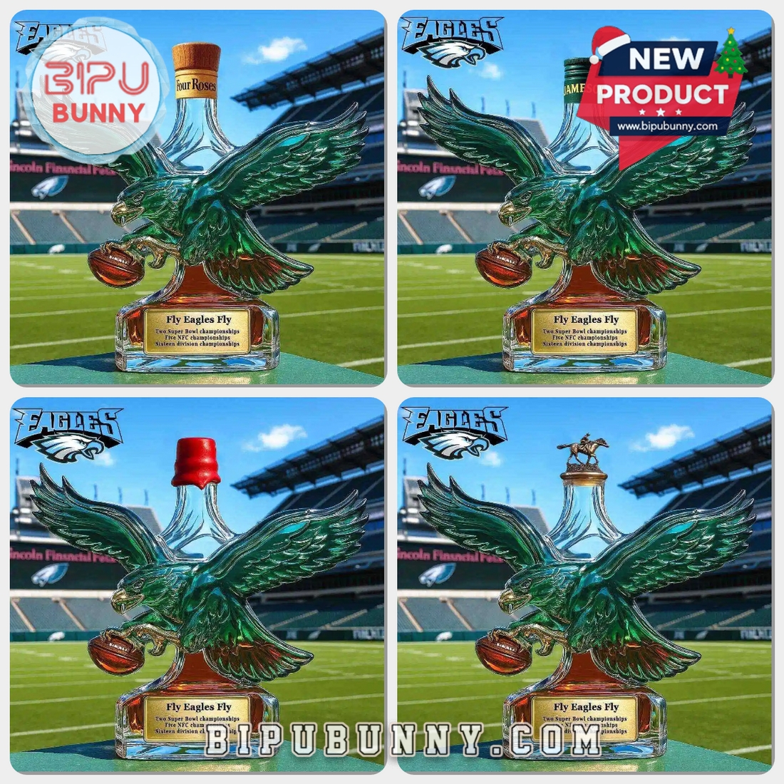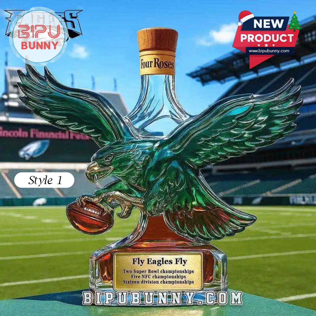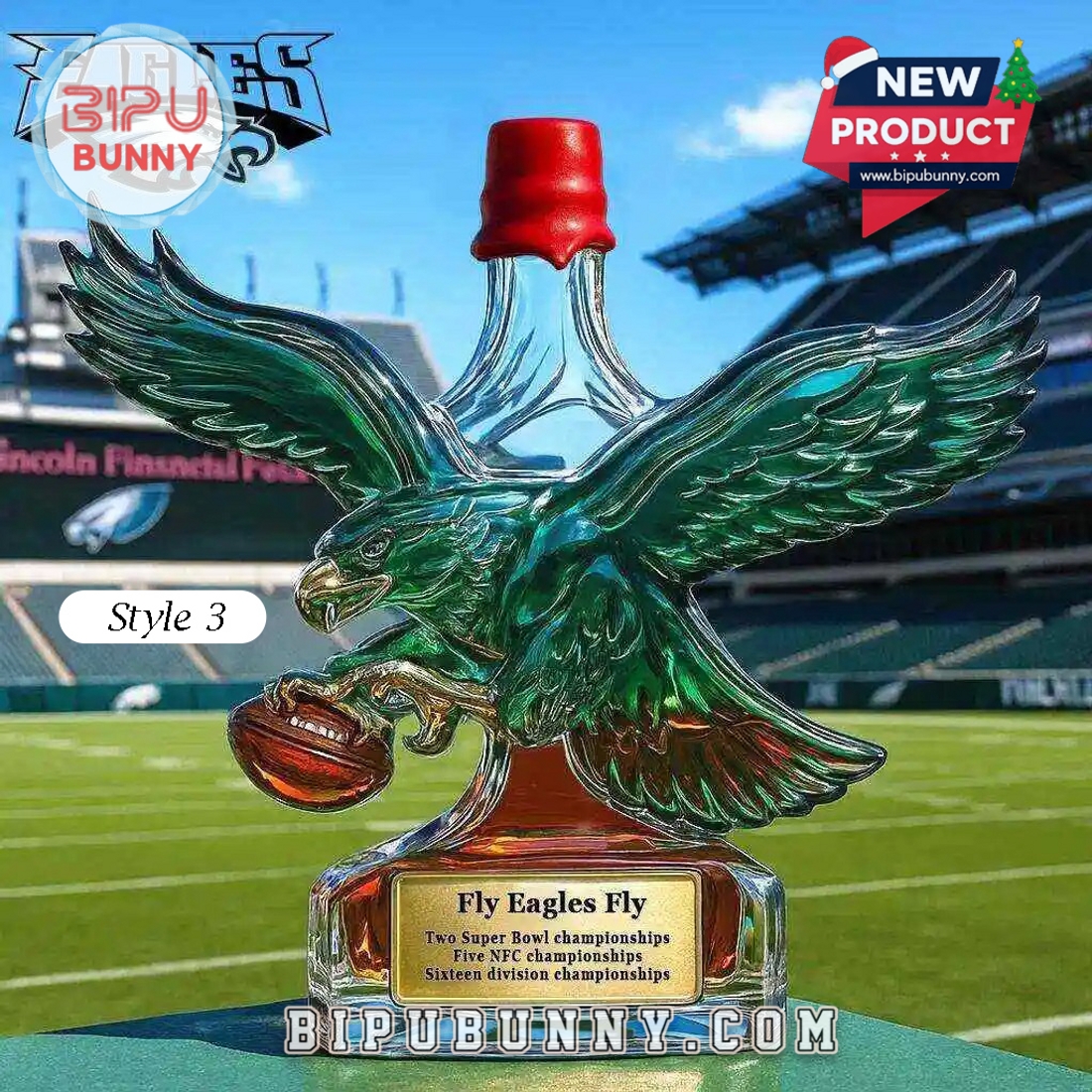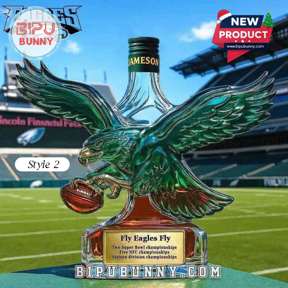 The Philadelphia Eagles Retro Logo Whiskey Bottle is a decorative glass bottle designed for fans who value both visual impact and practical use. The bottle features a deep emerald green eagle with outstretched wings, paired with a clear glass body that highlights the rich amber tone of whiskey inside. The base is thick and transparent, giving the bottle a solid and balanced feel on any surface. At the front, a gold toned plaque displays engraved championship achievements, positioned neatly at the center of the base for easy viewing. The eagle clutches a football, adding a dynamic sports detail that reinforces the team identity without overwhelming the design.