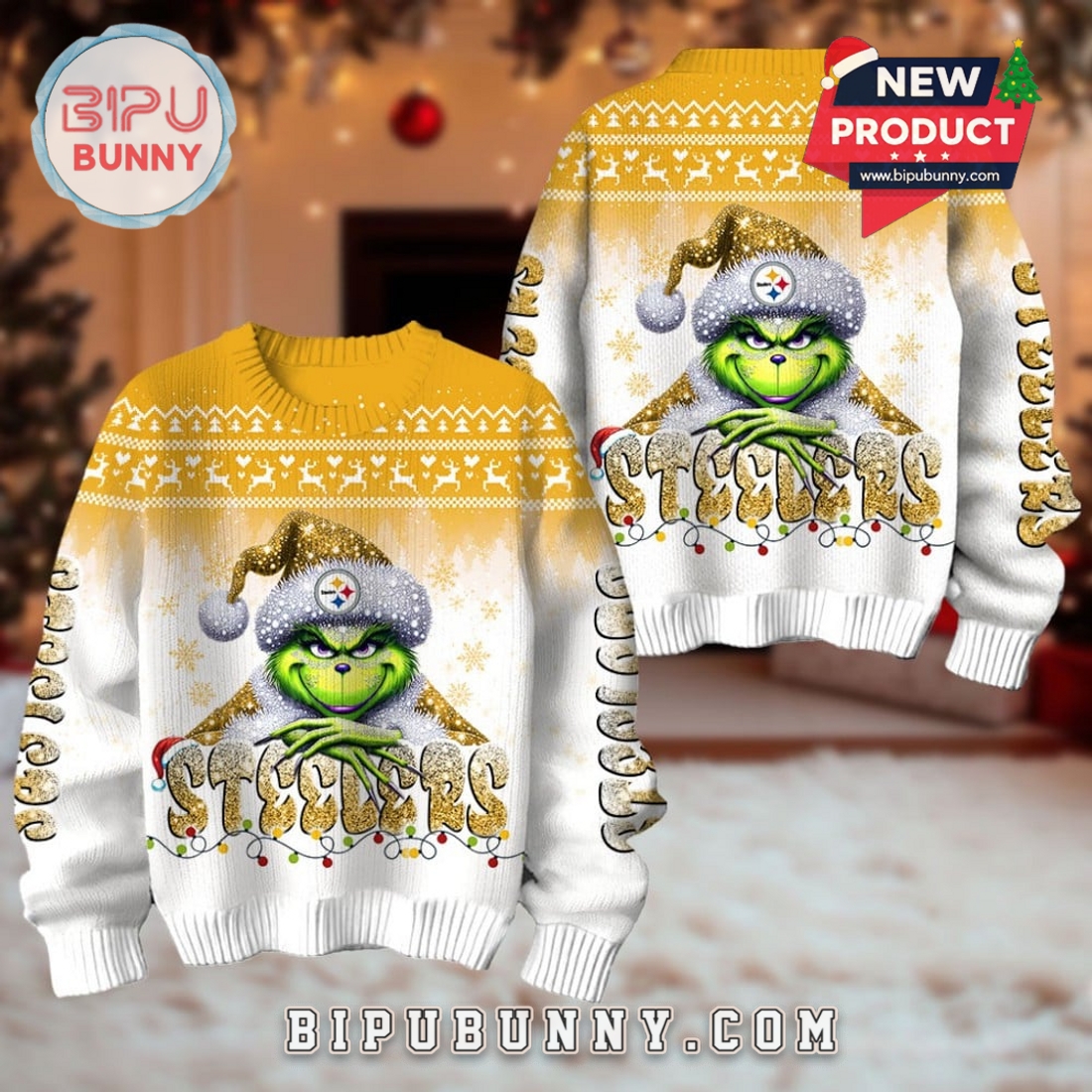 Bring some mischief and team pride to your holiday celebrations with the Pittsburgh Steelers Grinch Ugly Christmas Sweater 2025! This festive design perfectly balances humor, warmth, and loyalty to your favorite team. The sweater features a bold gradient blend of golden yellow fading into soft winter white—an homage to the Steelers’ iconic colors. Made from a high-quality polyester-cotton knit blend, it delivers lasting comfort and flexibility, making it ideal for chilly December nights or spirited holiday gatherings.