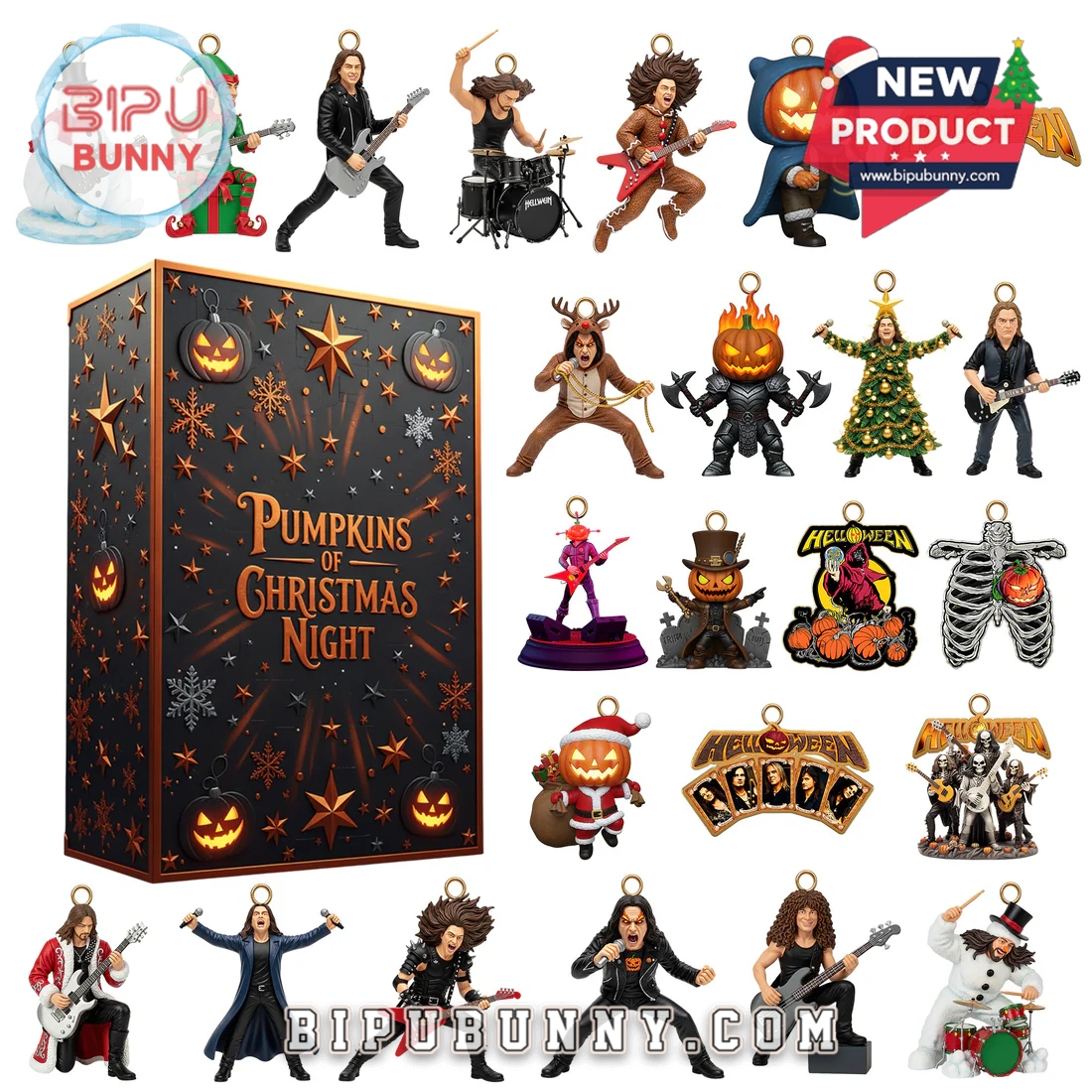 The Pumpkins Christmas Night Advent Calendar 2025 brings a heavy-metal attitude to the cozy warmth of the holidays. This product combines Halloween-inspired visuals with Christmas spirit, wrapped into a collectible calendar filled with surprises. The box itself is a deep matte black, decorated with bright orange pumpkins, metallic gold stars, and silver snowflakes, making it a striking centerpiece under any tree. It’s tall, sturdy, and features 24 perforated windows hiding a mix of rock-themed ornaments and quirky characters.