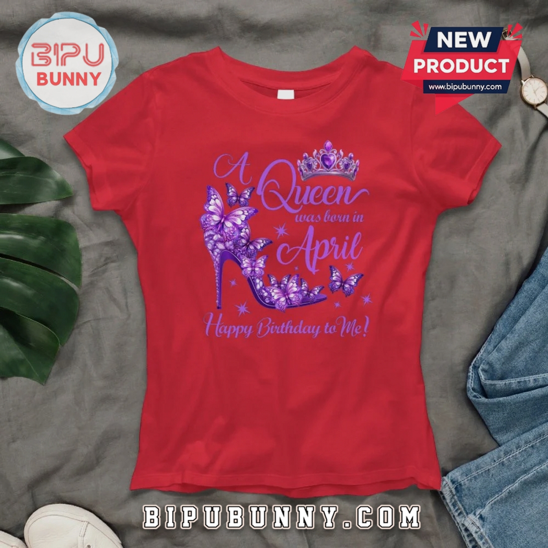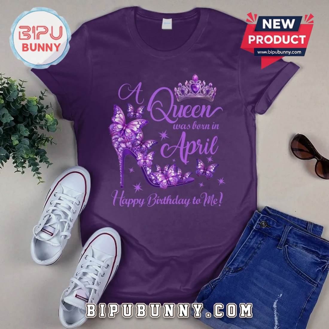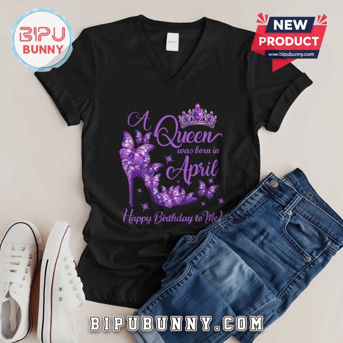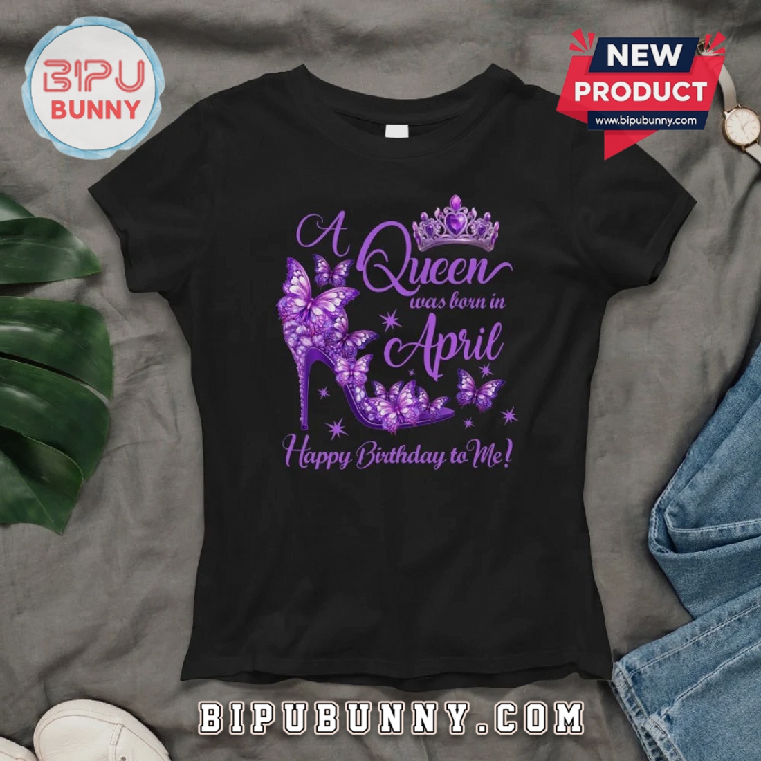 Celebrate your April birthday with unique style. This graphic tee features a striking butterfly and shoe design, perfect for any Queen.