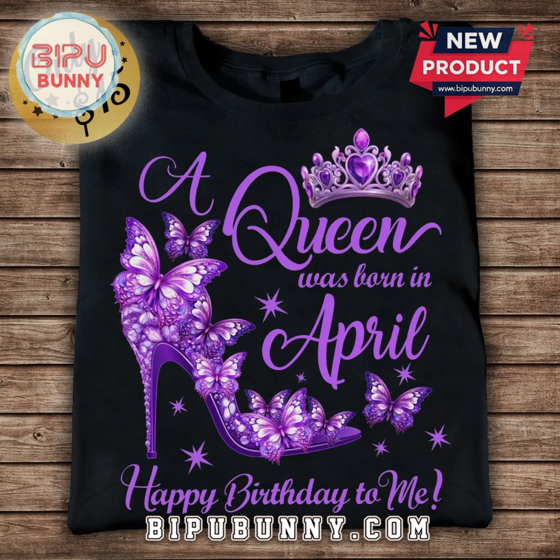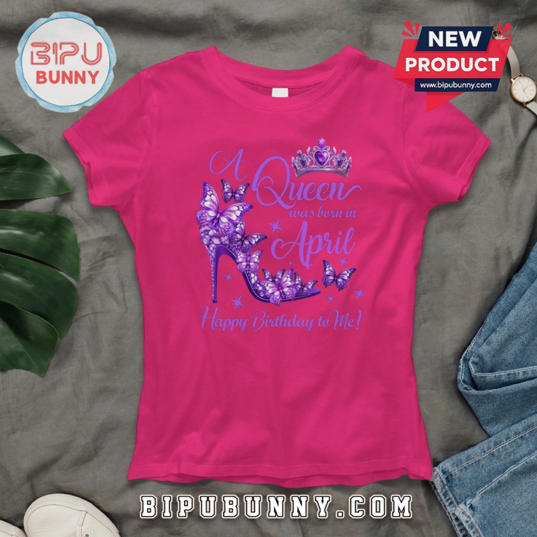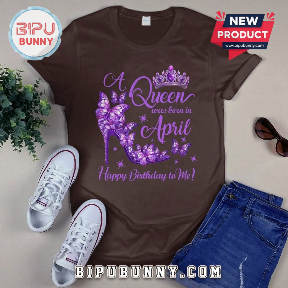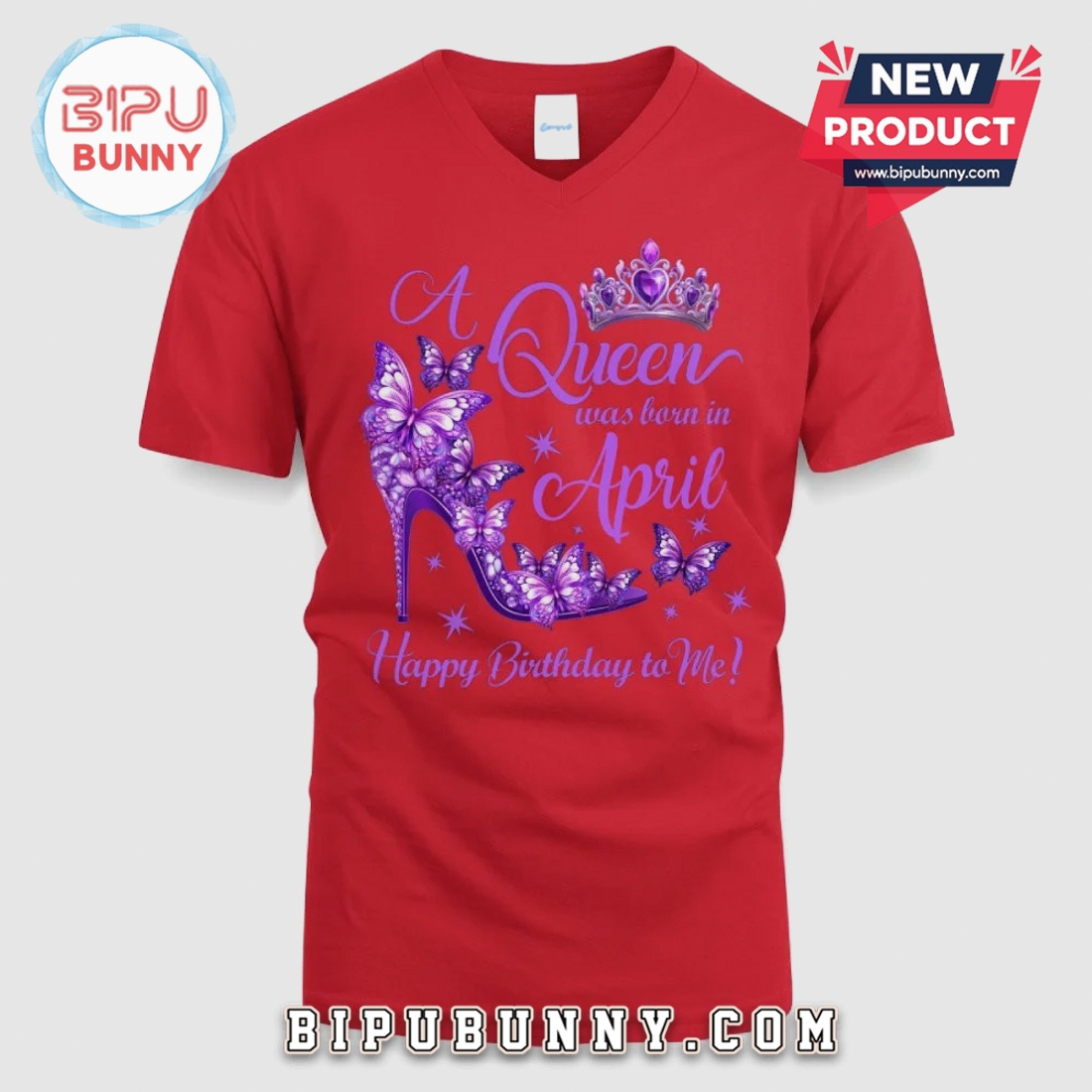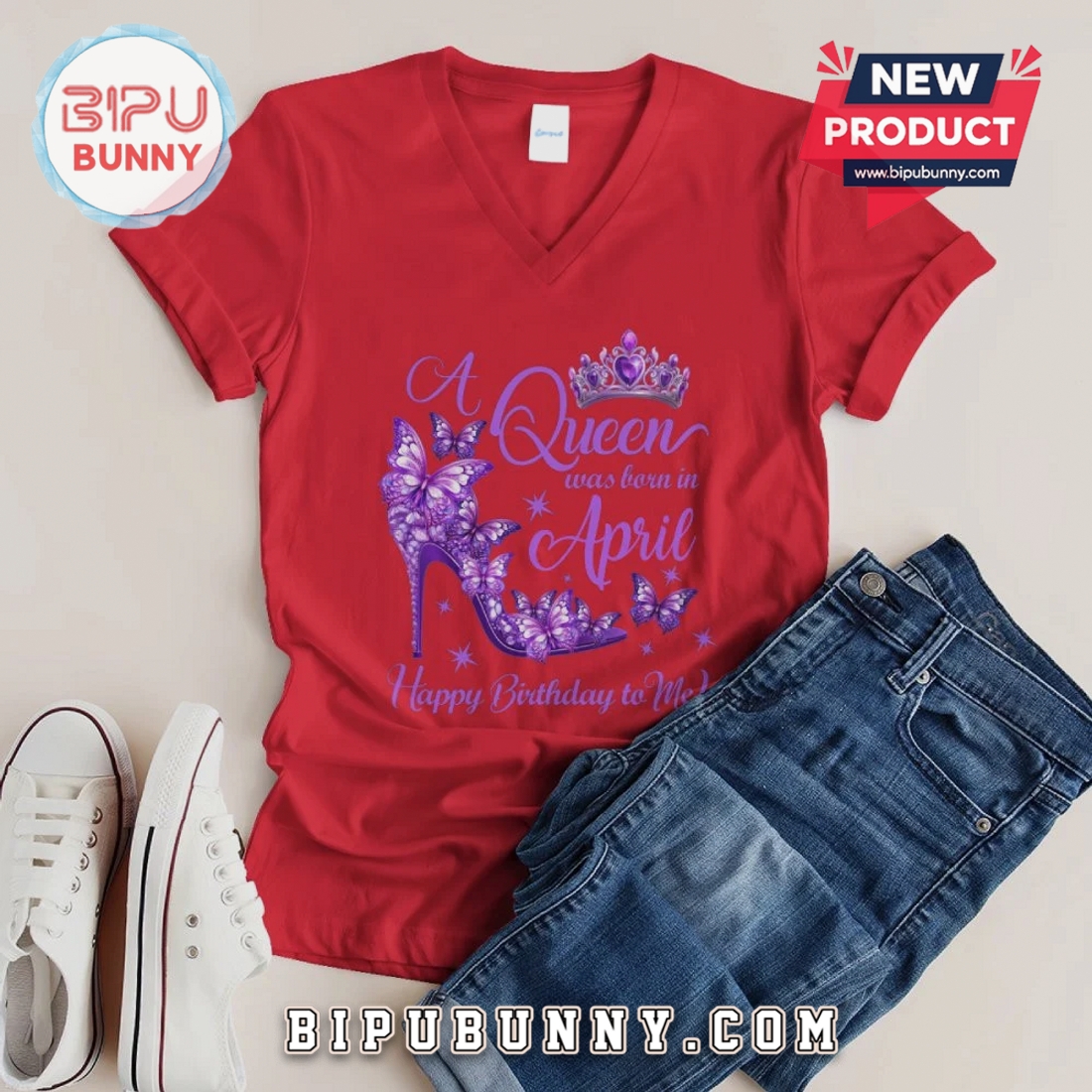 Celebrate your April birthday with unique style. This graphic tee features a striking butterfly and shoe design, perfect for any Queen.
