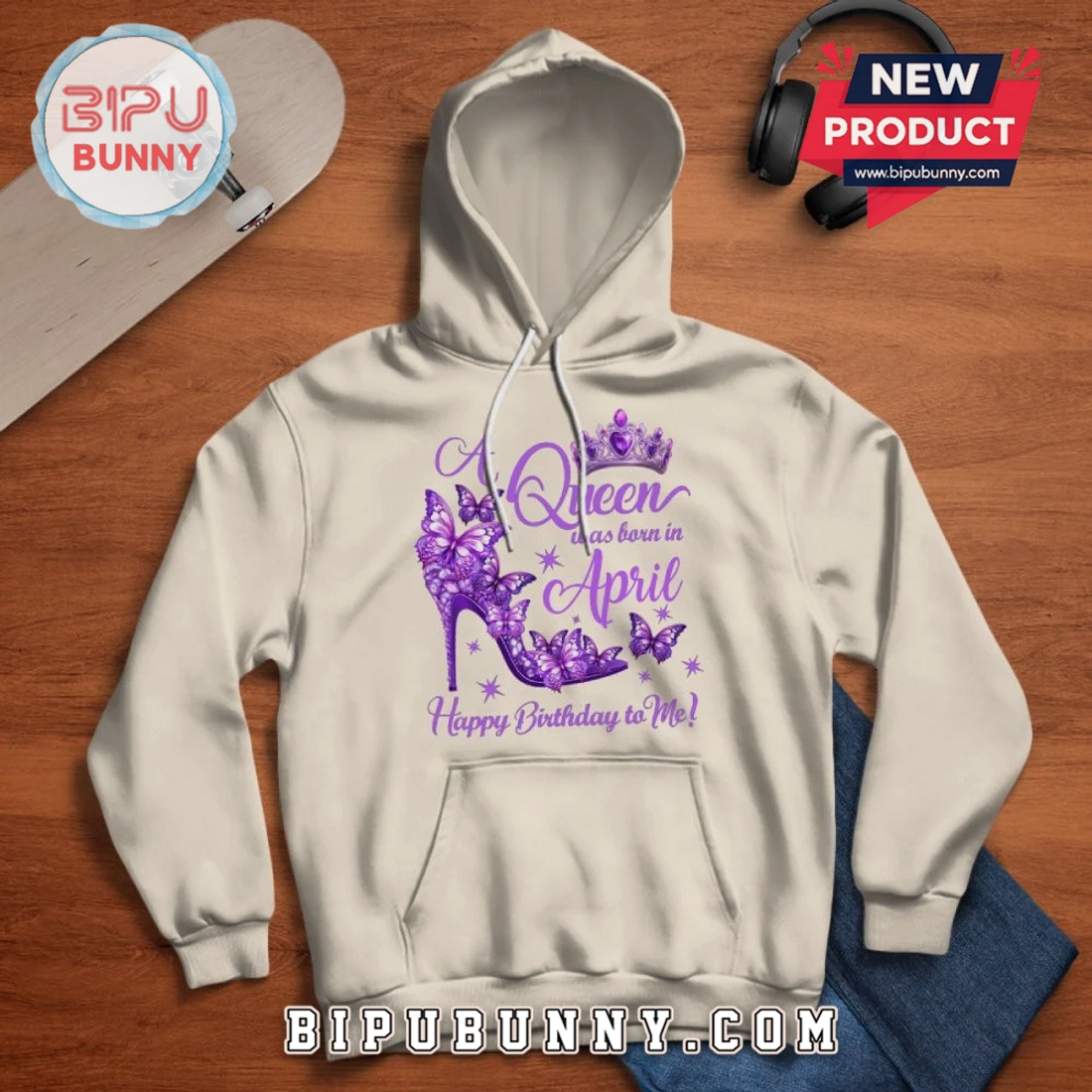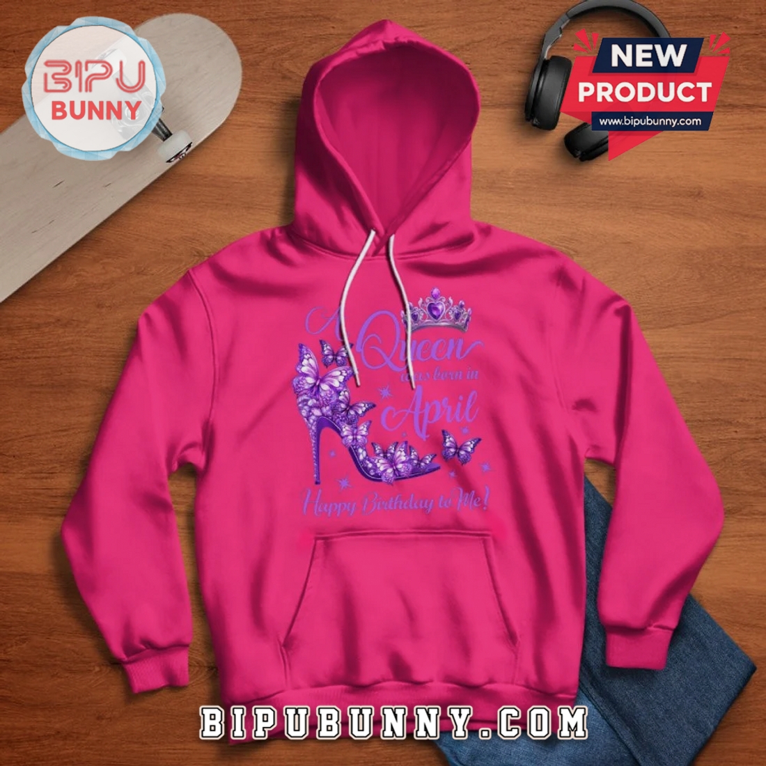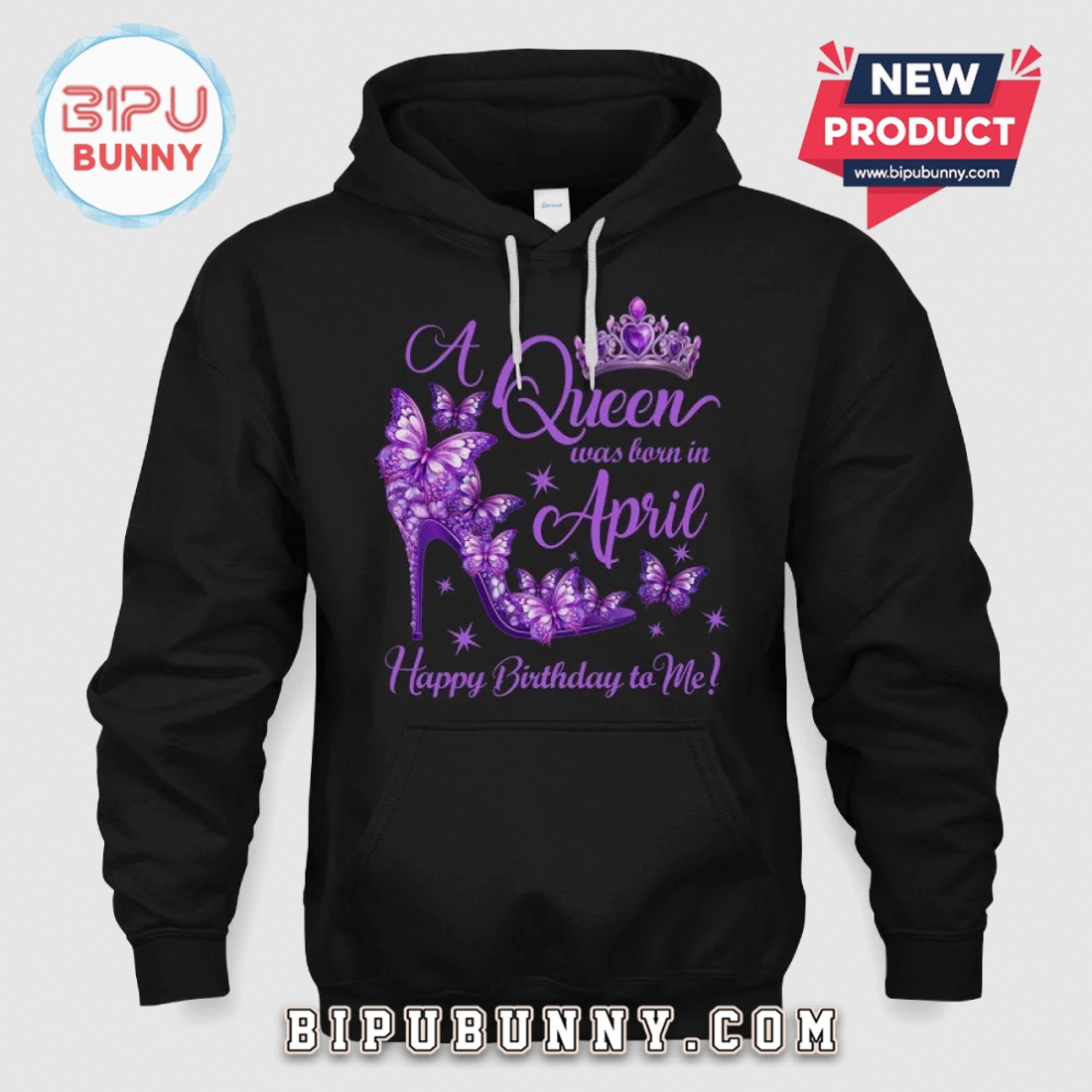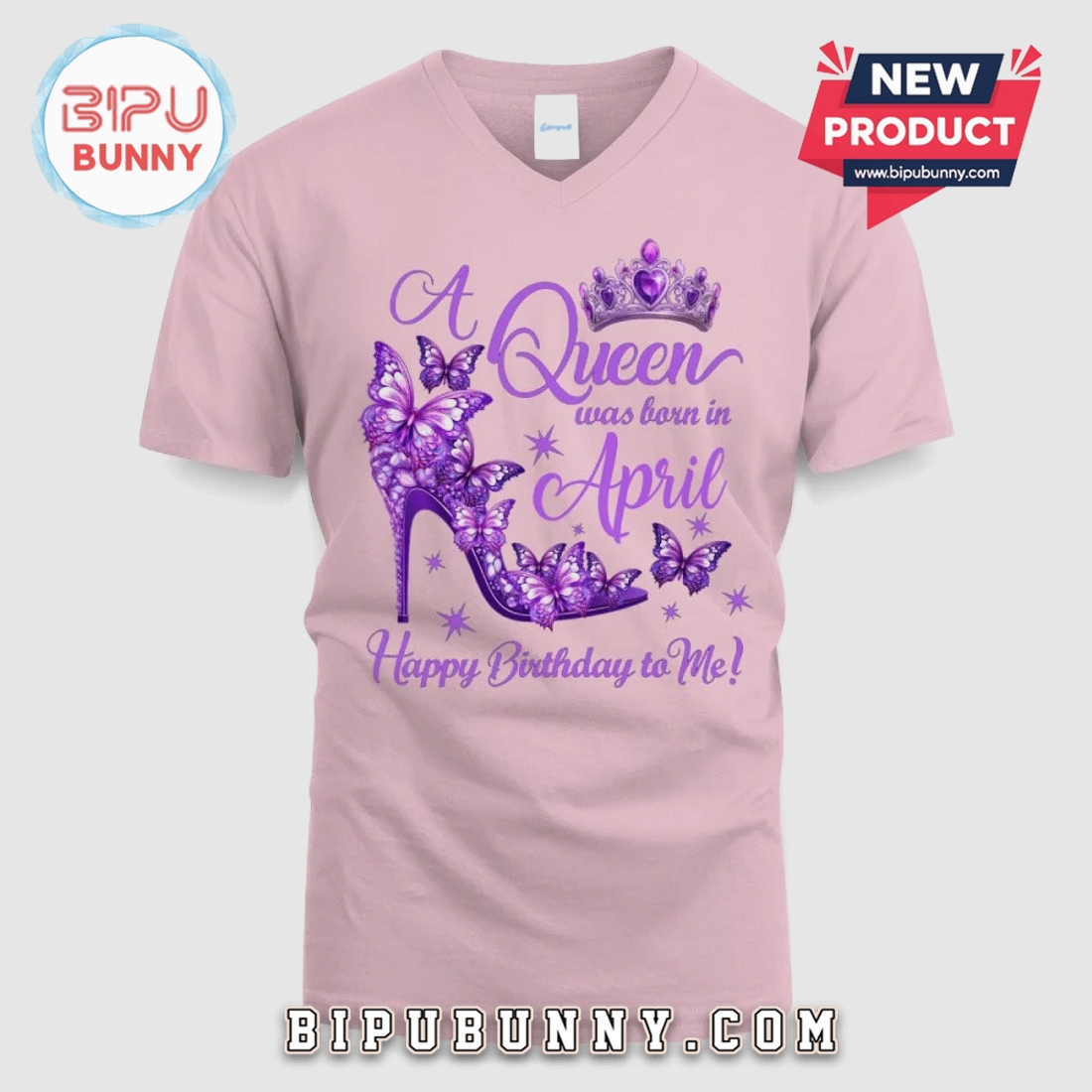 Celebrate your April birthday with unique style. This graphic tee features a striking butterfly and shoe design, perfect for any Queen.
