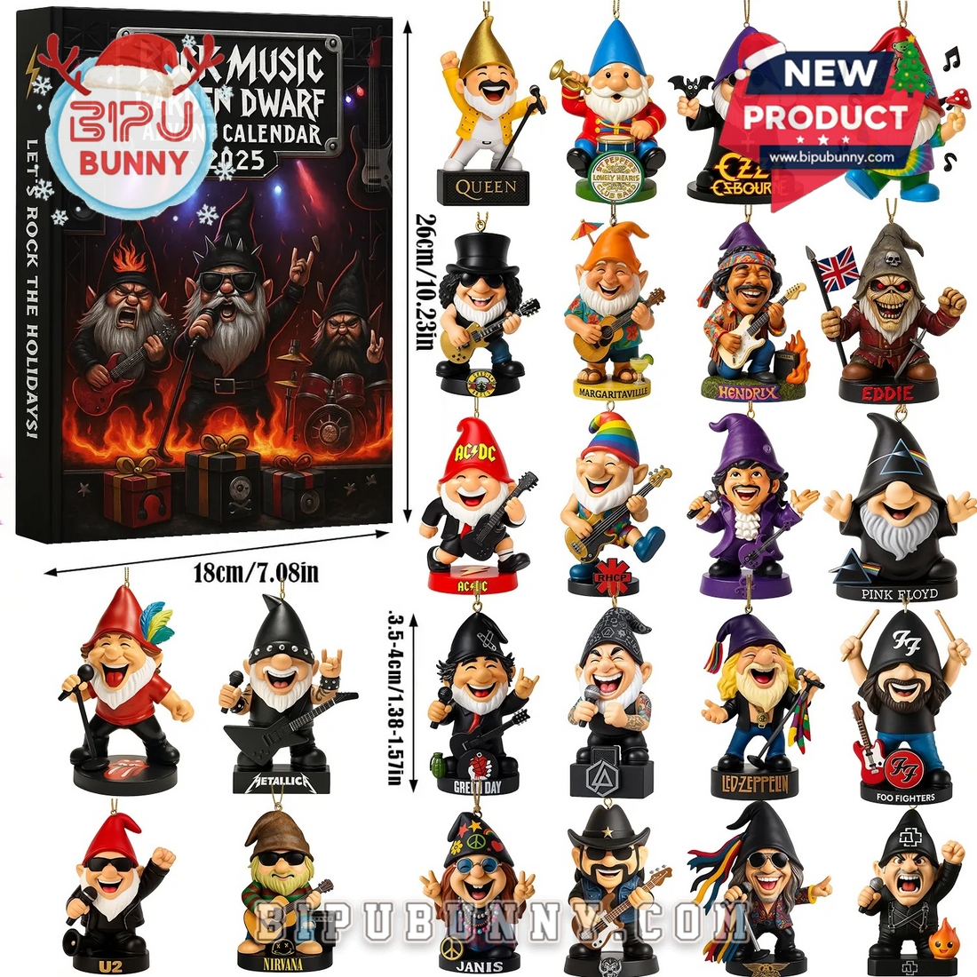 Each of the 24 compartments houses a collectible gnome dressed as a famous rock star from iconic bands like Queen, AC/DC, and Led Zeppelin. These quirky gnomes are equipped with miniature instruments, signature band logos, and even details like hats and accessories that make them resemble their rock-star counterparts. Made from durable materials, these figures are built to last and come with a small hook for easy hanging. You can display them on your tree or around your home, adding a touch of rock music to your holiday décor. The calendar itself features fun illustrations, including guitars, amplifiers, and a stage backdrop that ties into the theme of a rock concert, giving fans a creative and enjoyable way to count down to Christmas.