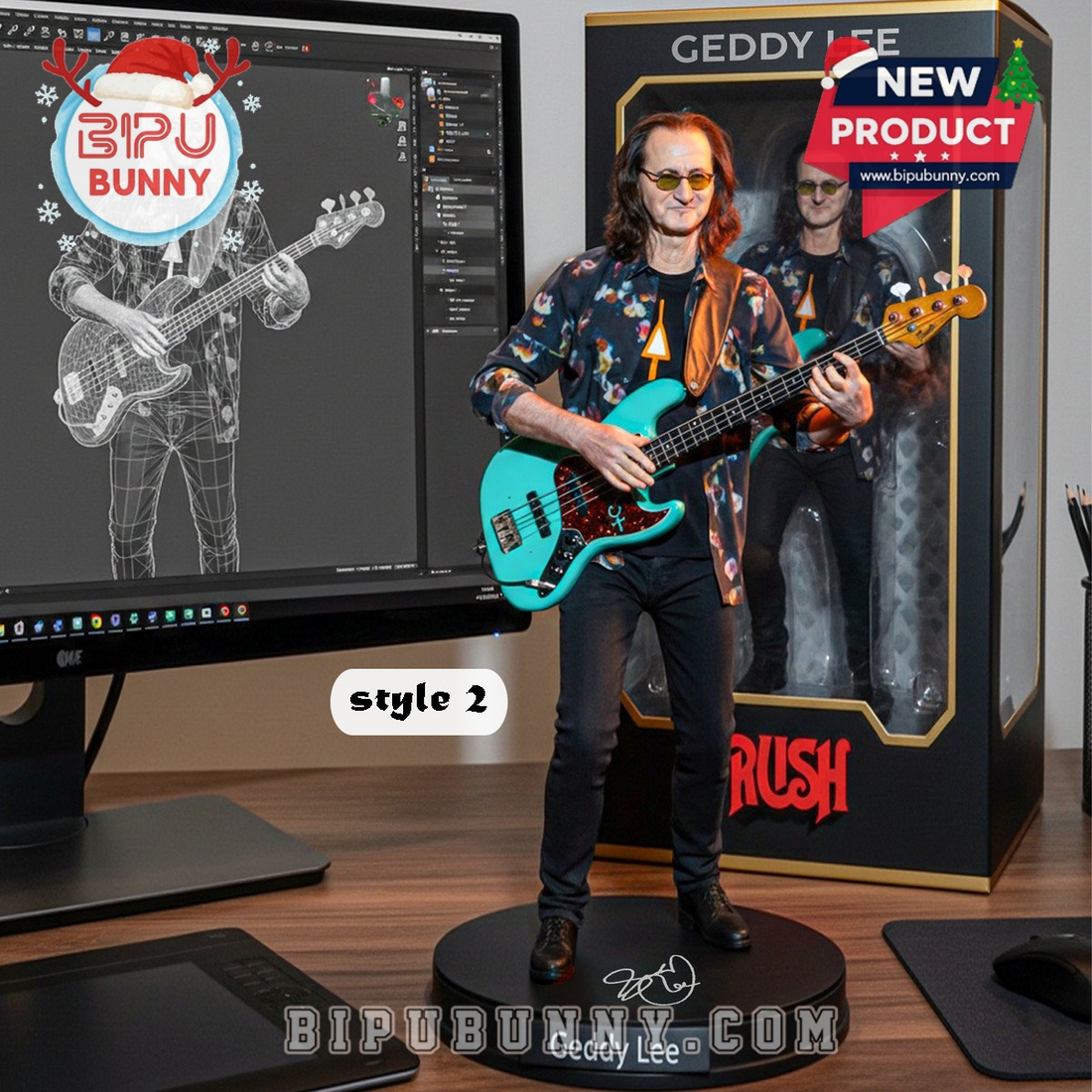 - Style 2 – Geddy Lee Edition: Highlights Geddy in a vibrant floral shirt, holding his iconic turquoise bass. Look closely and you’ll spot tiny bass string etchings layered into the background for added realism.
