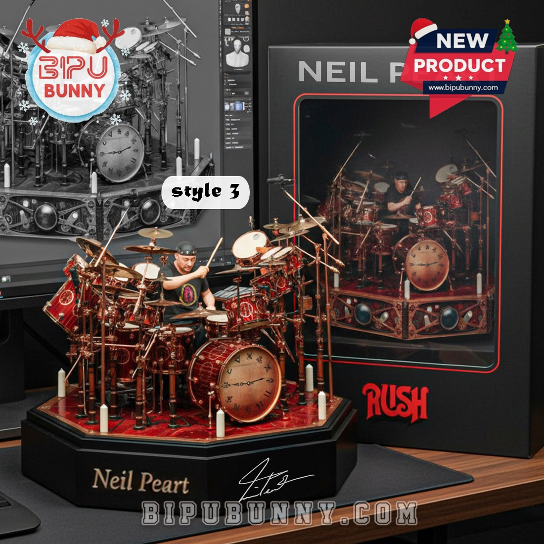 - Style 3 – Neil Peart Edition: This style brings the full energy of Neil’s legendary drum set to life. His figure is surrounded by a circular drum stage design, complete with candle illustrations and cymbal highlights that shimmer under light.