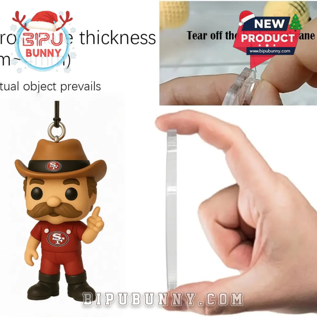 Inside, the calendar holds 24 compartments, each hiding a unique collectible ornament. The collection includes miniature figures of beloved 49ers players, a festive snowman, a Christmas tree, and various team-themed decorations. Each ornament is meticulously detailed, with the team logo prominently displayed and designs that blend football with Christmas cheer. Some items even feature fun additions like a football helmet or jersey-wearing Santa figures.