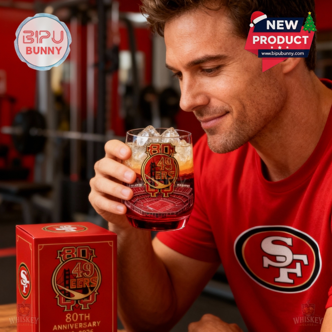 The San Francisco 49ers 80th Anniversary Whiskey Glass is more than just drinkware—it’s a bold tribute to eight decades of NFL greatness. This collector’s item is instantly eye-catching, combining deep crimson red, golden amber, and transparent glass layers that reflect the team’s signature colors. At the heart of the design is the 49ers 80th anniversary emblem, featuring the Golden Gate Bridge in fine detail, surrounded by strong, clean typography and golden accents. Just beneath the logo, the entire Levi’s Stadium wraps around the base of the glass in a full-color 3D print, giving it a panoramic effect from every angle.