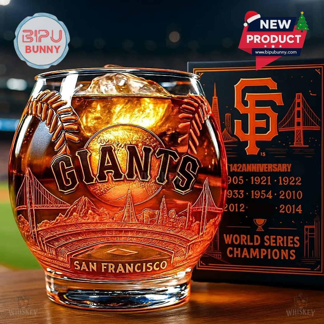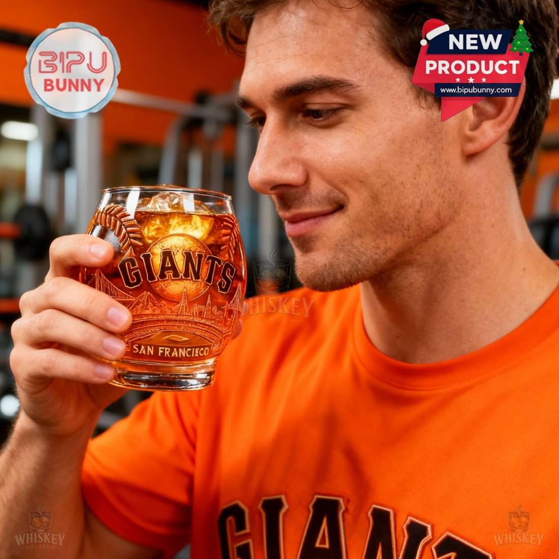 Surrounding the main logo are finely engraved details, including a stylized stadium scene and the Golden Gate Bridge, placed along the lower curve of the glass. These small decorative elements are subtle but meaningful, becoming more visible as light passes through the liquid. The engraving is smooth to the touch and designed to resist fading over time. The anniversary theme is reinforced through carefully arranged typography and symbols that honor over a century of Giants history. This glass is suitable for whiskey, bourbon, or even non alcoholic drinks, making it practical for daily enjoyment while still carrying collectible value. Some editions may come with a matching presentation box featuring team colors and championship references, offering a complete display ready option for collectors or gifts.