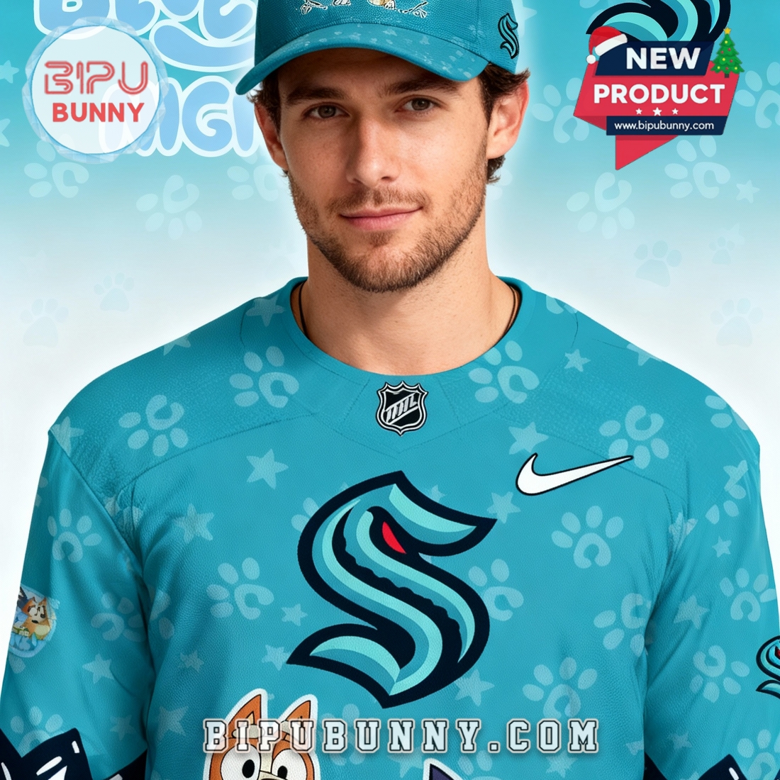 Grab your Seattle Kraken Bluey Night Jersey now before it skates off the shelves! Visit bipubunny.com for limited drops, team variants, and upcoming Bluey x NHL designs!