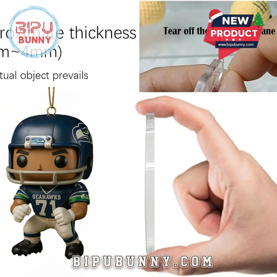 Behind those 24 doors, you will find a fantastic collection of miniature ornaments that are designed in the popular Funko Pop style! These aren’t just flat pictures; they are high-quality, acrylic-like ornaments, each with an approximate thickness of 3mm to 4mm! They come with a protective film that you can peel off to reveal a perfectly clear, vibrant collectible! The collection includes figures of various Seahawks players in their recognizable navy and green uniforms, often posed holding a football! You also get ornaments featuring important team symbols like a replica of the Super Bowl XLVIII trophy! Other items include a Seahawks helmet, a 12th Man flag proudly waving, and miniature figures of the team’s beloved mascots, Blitz and Taima! The ornaments are designed with a small loop or hook on top, making them instantly usable as Christmas tree decorations or fun keychains! Imagine the excitement of unwrapping a new piece of Seahawks history every morning!