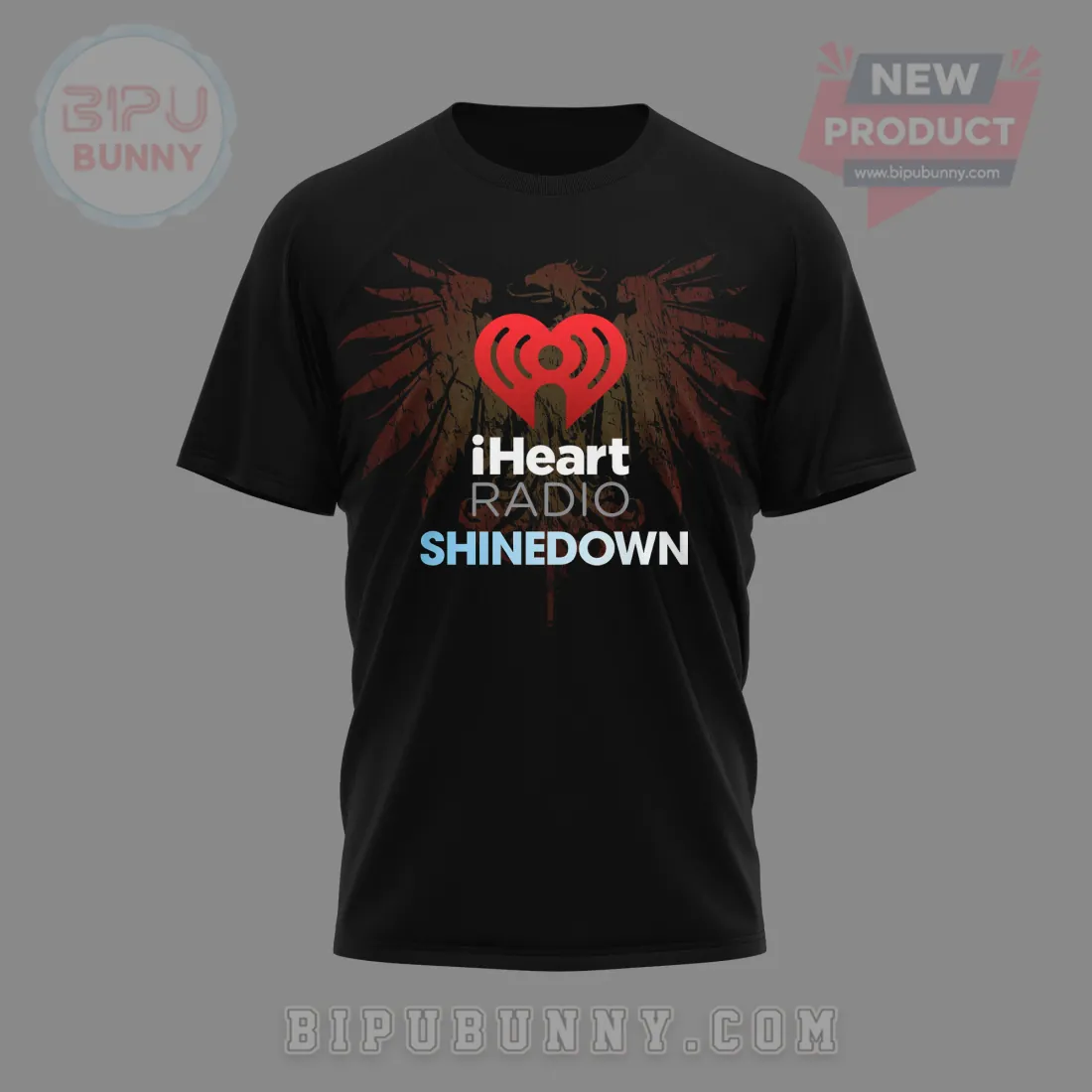 The striking red of the iHeartRadio heart logo and the subtle blue-to-white gradient of “SHINEDOWN” powerfully contrast against the dark background and the earthy tones of the wings. This bold color choice ensures the graphic’s elements are highly visible and visually arresting, embodying the energetic spirit of rock.