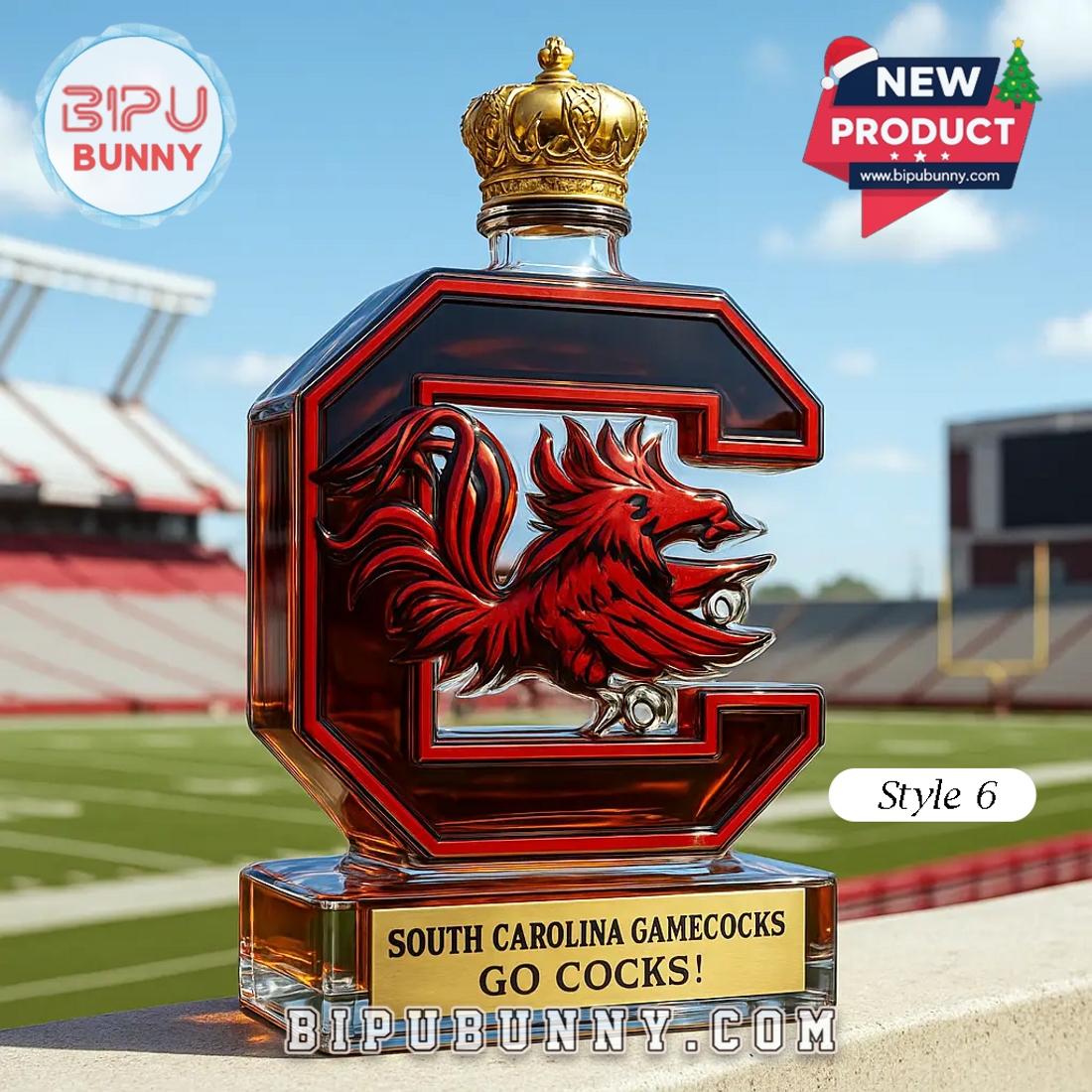 The South Carolina Gamecocks Limited Edition Whiskey Bottle is a bold decorative bottle designed for fans who value team identity and visual impact in one solid piece. The bottle is shaped like a strong letter C and made from thick transparent glass filled with a deep red tone that mirrors the official team colors. At the center sits a raised rooster emblem with sharp feather lines and a powerful stance, positioned slightly forward to add depth and shadow from every angle. The base is wide and flat, supporting the bottle securely while holding a gold tone nameplate engraved with team text that remains easy to read even from a distance.