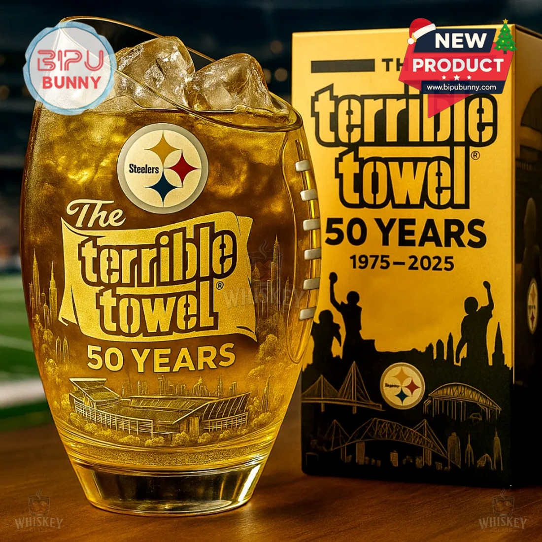 The Steelers Terrible Towel 50th Anniversary Whiskey Glass is a bold, fan-focused collectible that brings together iconic Pittsburgh pride and a love for great drinkware. Designed in the shape of a football, the glass stands out instantly with its rounded curves and textured laces on the side. The clear glass is tinted in a golden amber tone that adds a warm, celebratory feel—ideal for whiskey, bourbon, or any chilled beverage. On the front, it features the officially licensed Steelers logo above the bold “The Terrible Towel” lettering, along with the text 50 YEARS 1975–2025. Just beneath, detailed etched artwork showcases a skyline view and a stadium rendering—believed to reflect Pittsburgh’s Heinz Field—adding a layer of depth and local tribute.