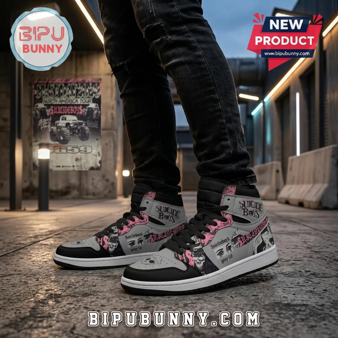 Shop high-quality Suicideboys Grey Day 2026 Custom High-Top Fan Sneakers today at Bipubunny and enjoy exclusive discounts. Choose your perfect size, explore the full photo gallery, and step out in comfort and classic AJ1 style!