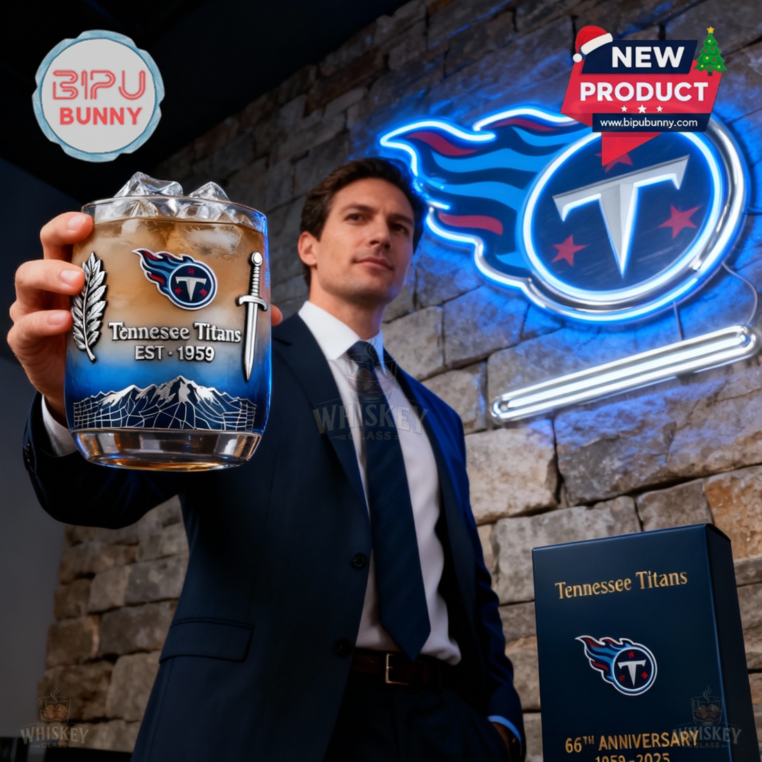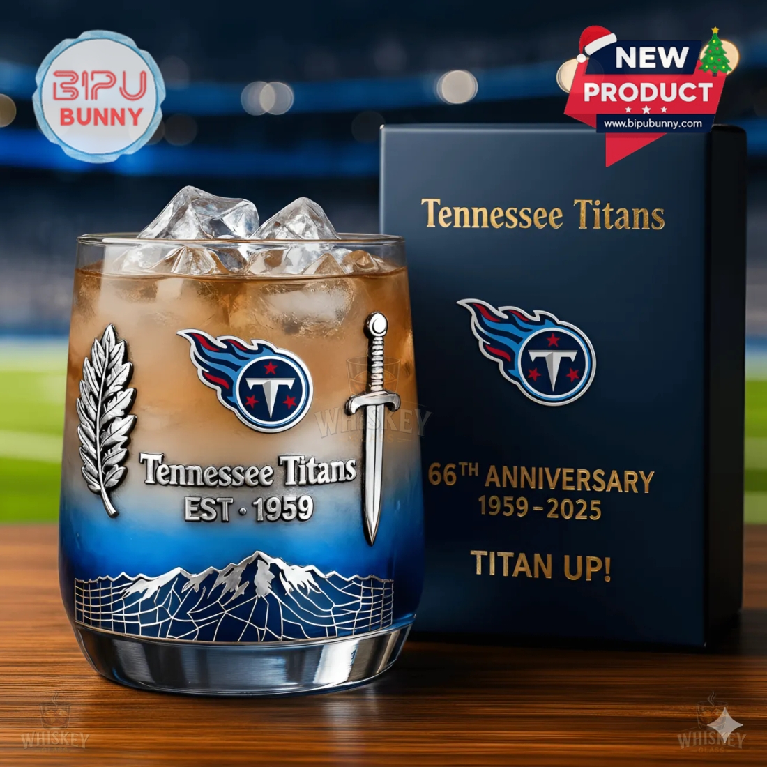 Every detail is placed with care. The “Tennessee Titans EST. 1959” text is centered below the logo, framed by the sword and laurel. A small but eye-catching engraving on the back reads “66th Anniversary 1959–2025,” giving it a collectible edge. The glass comes in a black and gold gift box with matching logos and messaging, making it an ideal gift. The smooth, weighted base adds balance, giving you a satisfying grip for sipping whiskey, bourbon, or any preferred drink.