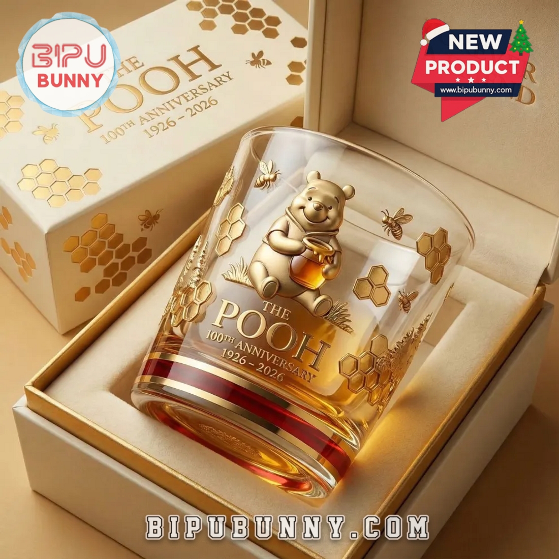 The The Pooh 100th Anniversary Whiskey Glass blends warm nostalgia with refined drinkware in a way that feels special every time you pour. The glass is made from clear premium crystal style glass, thick at the base and smooth around the rim for a balanced and comfortable hold. Across the surface, detailed gold toned embossing brings Pooh to life as he sits holding a honey pot, surrounded by small flying bees and honeycomb shapes that wrap gently around the glass. On the front, the text The Pooh 100th Anniversary 1926 2026 sits neatly under the artwork, giving the piece its official commemorative look. When filled with whiskey, bourbon, or any amber drink, the liquid glows through the golden designs, creating a warm and inviting feel. The heavy bottom helps the glass stay steady on a table, and the rounded lip allows for a smooth sip with every drink. This edition is available as a single collector glass and also in a gift box set, making it perfect for personal use or giving.