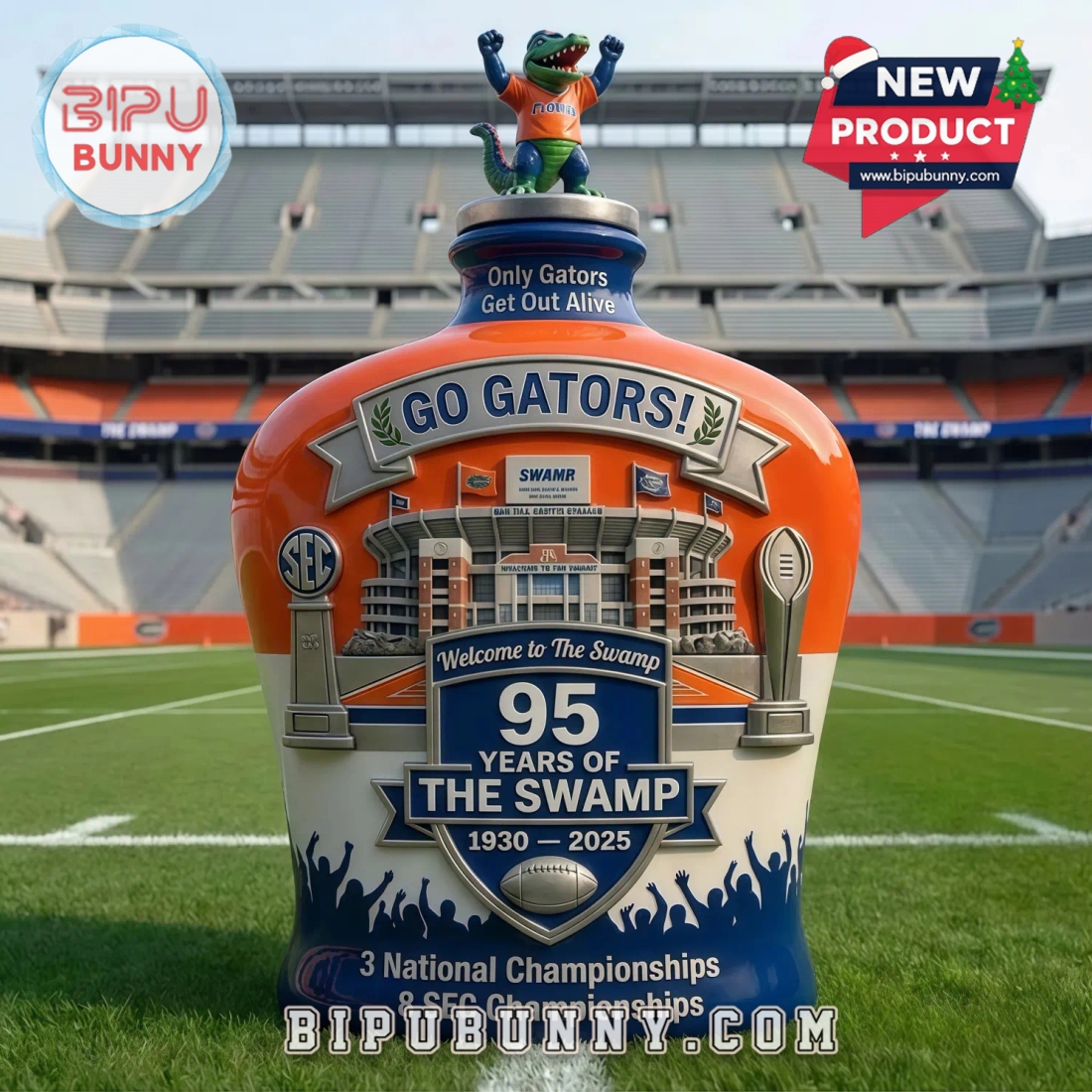 The Swamp 95th Anniversary Whiskey Decanter is a remarkable tribute to the legendary home of the Florida Gators, The Swamp. Designed to commemorate 95 years of history, this decanter is more than just a functional item—it’s a symbol of tradition, passion, and pride. The decanter is shaped to resemble the iconic Florida Gators’ stadium, with intricate details that capture the essence of this historic venue. The decanter features vibrant orange and blue hues, perfectly reflecting the Gators’ team colors. The logo of the stadium and key elements like the football field outline and stadium structure are carefully molded, adding a layer of authenticity to the design.