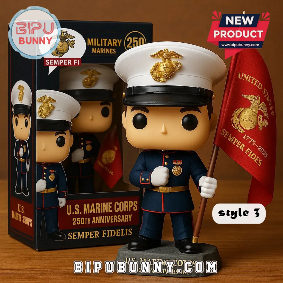 Available in different styles, each figure features a Marine Corps soldier holding a flag with the 250th-anniversary emblem. The vibrant colors, especially the deep reds and golds, reflect the Marine Corps’ identity and honor. These standees are designed to be highly eye-catching and serve as perfect decor for any home, office, or collection space. The compact size makes them easy to display on a desk, shelf, or mantelpiece, adding a touch of pride and history to any room.