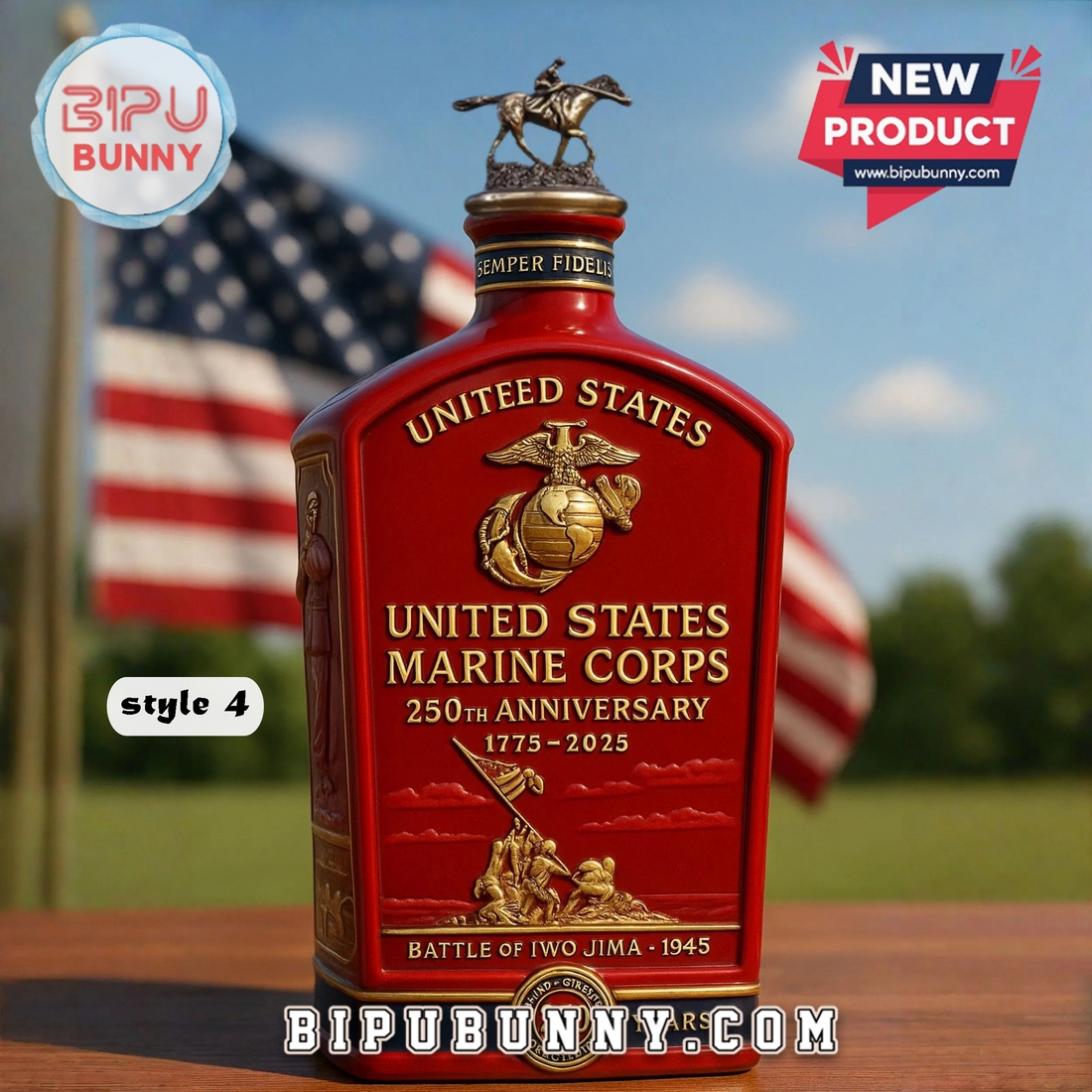 The U.S. Marine Corps 250th Anniversary Whiskey Bottle is available in different styles, each offering a unique design, such as the crown-topped bottle or the one with a miniature Marine raising the flag. These small yet powerful design features enhance the bottle’s historical significance and make it a remarkable piece for collectors or those who admire the bravery of the U.S. Marine Corps. It is not just a bottle; it is a symbol of respect for the legacy of the Marines.