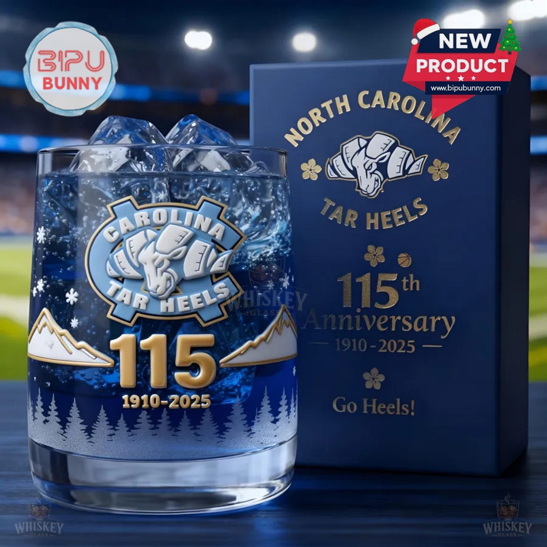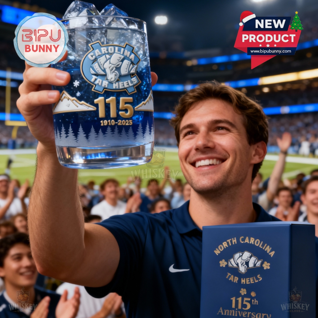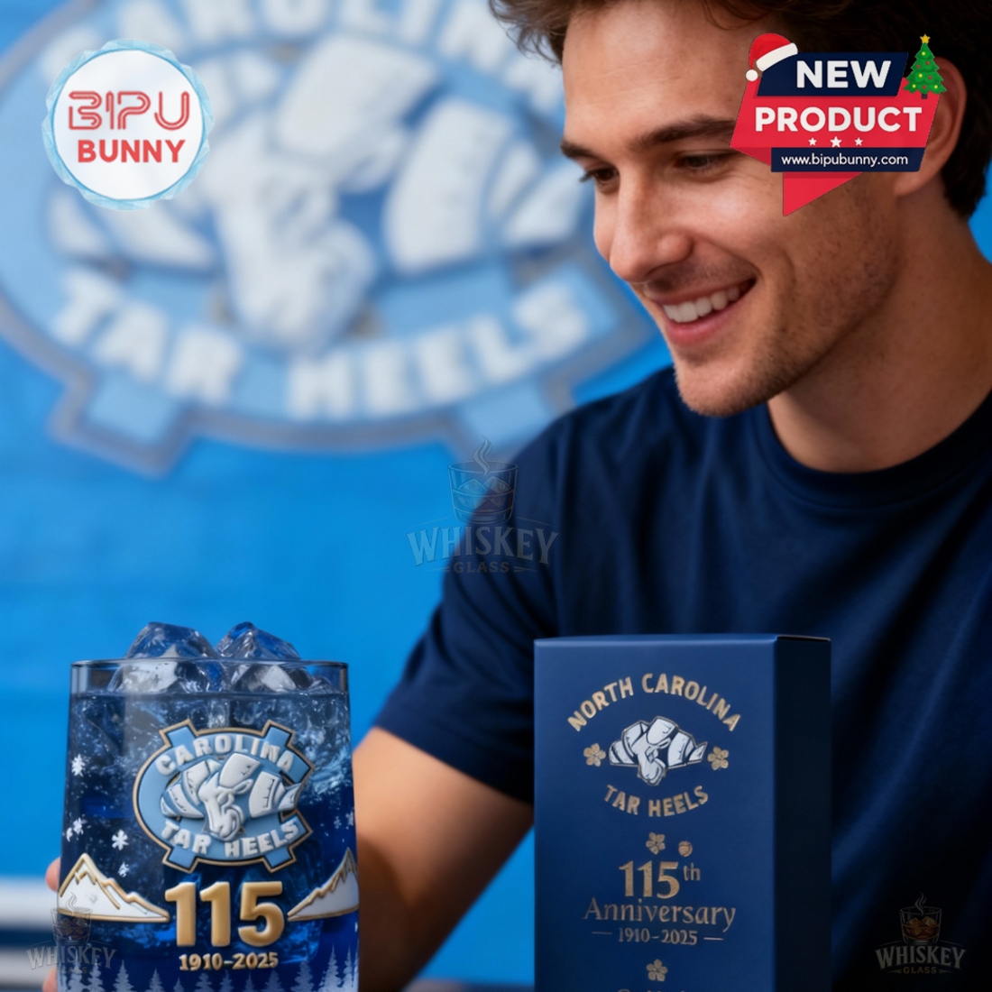The UNC Tar Heels 115th Anniversary Whiskey Glass is a commemorative piece created to honor more than a century of Tar Heels tradition, dating back to 1910. This glass features a rich deep blue color palette that reflects classic UNC tones, paired with clear, thick glass that feels solid and reassuring in the hand. The material is high quality tempered glass, designed to handle daily use while maintaining clarity and weight balance. On the front center, the iconic Tar Heels ram logo is prominently displayed, framed by a circular badge that immediately draws the eye. Just below it, the bold number 115 appears in gold, marking the anniversary years 1910 to 2025 with clean and easy to read lettering.
