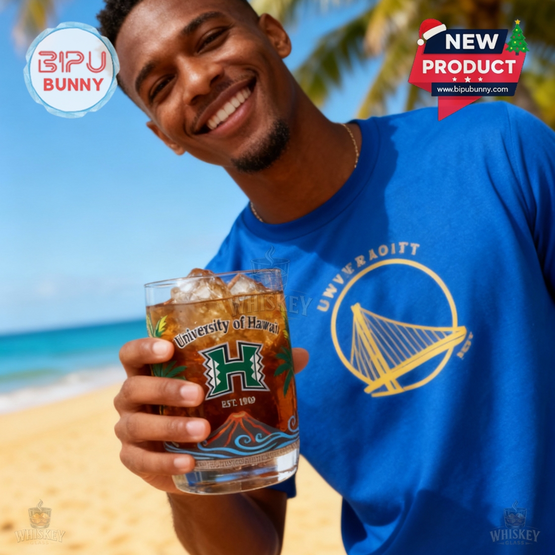 The University of Hawaii Warriors Whiskey Glass brings island pride and university legacy together in one bold, stylish piece. This glass features a clear, heavy-base design, built for both beauty and balance. Wrapped in a vibrant tropical theme, the front displays the official H Warriors logo in green, white, and black — centered proudly above “University of Hawaii” and “EST. 1909”. Around the sides, you’ll notice lush green palm trees, and just below the logo, a bright red volcano with lava streams and swirling ocean waves in blue — a vivid tribute to Hawaii’s natural power.