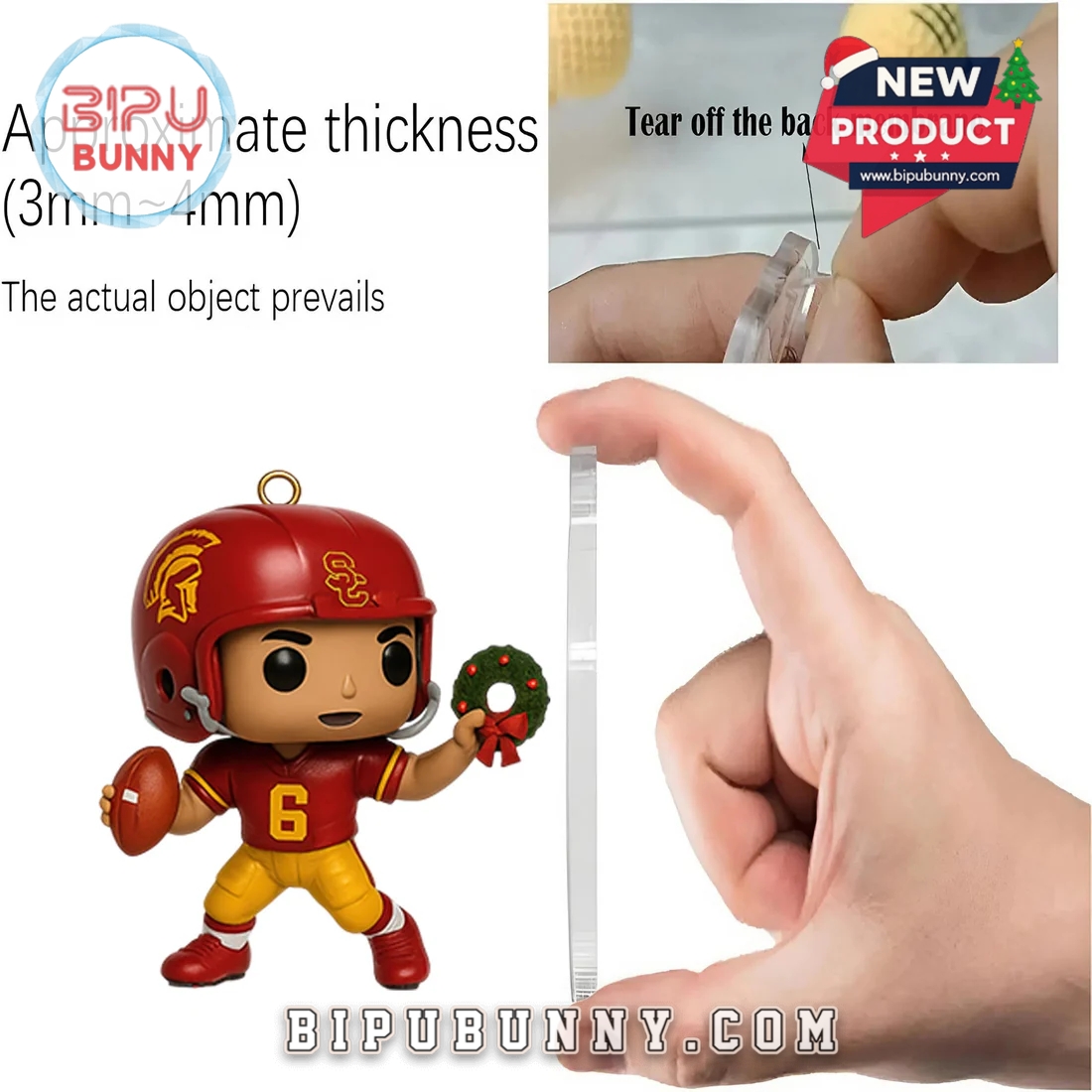 Inside, you’ll find 24 themed mini collectibles, each hidden behind a numbered flap. These pieces range from football player figurines in various action poses to ornaments shaped like a cleat, helmet, scarf, football, or the USC mascot. Some figures are decked out in holiday versions of their uniforms, like Santa hats or holding candy canes, while others highlight iconic game-day energy. The miniatures are made from durable acrylic (3mm–4mm thick) with vivid printing on both sides, giving them a high-gloss finish and clean-cut edges.