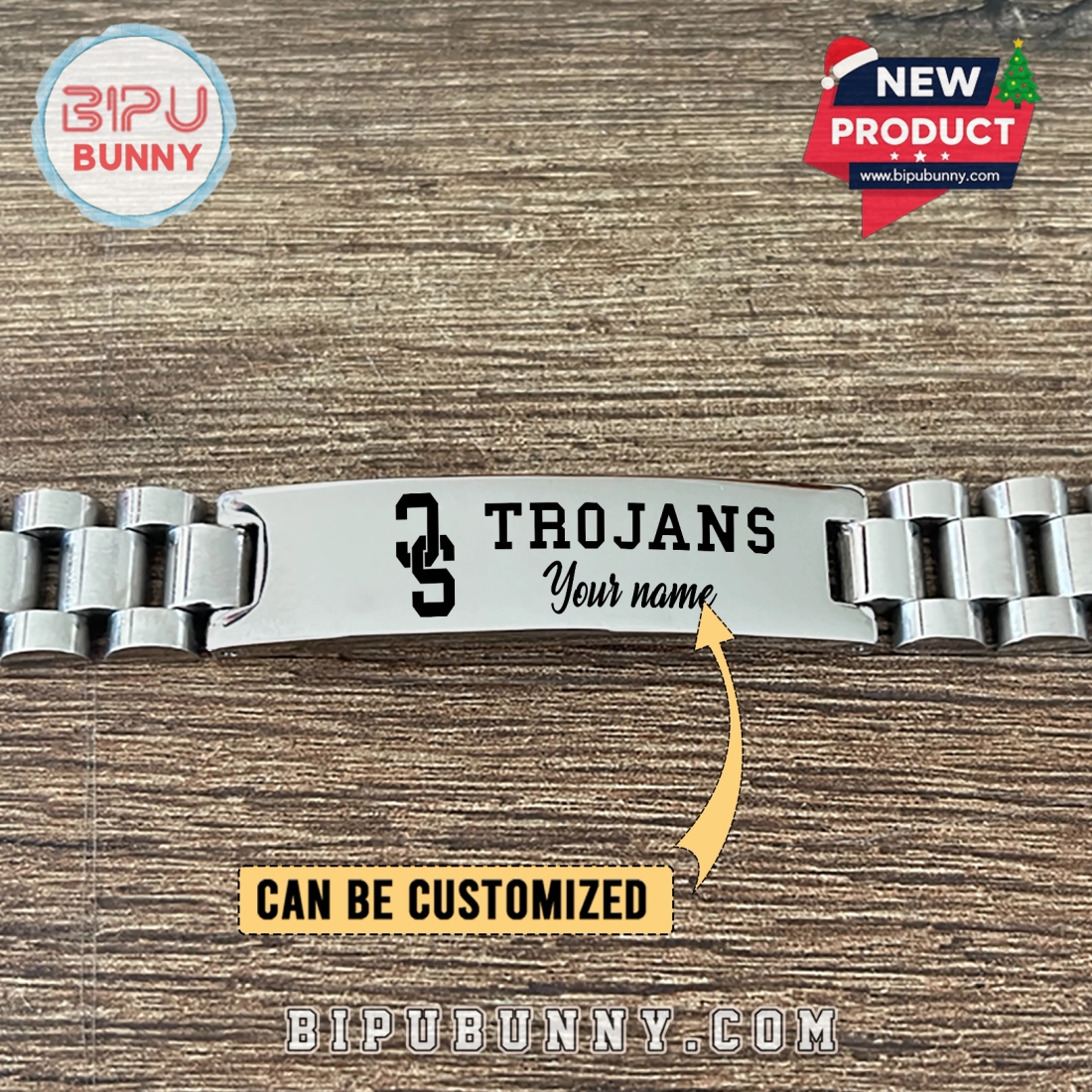 The USC Trojans Personalized Silver Bracelet brings together elegance, durability, and school spirit in one sleek design. This bracelet shines in polished silver, offering a clean and modern look that captures attention without being too flashy. Made from high-quality stainless steel, it’s resistant to tarnish and corrosion, maintaining its brilliant finish even after years of wear. At the center of the bracelet lies the engraved USC Trojans logo, paired with the team name in bold black lettering, symbolizing loyalty and strength. Beneath the logo, a customizable name section allows you to personalize the piece with your own name, a special date, or a meaningful word. The smooth metal surface and curved plate rest comfortably on the wrist, while the linked steel band adds structure and flexibility. Its secure clasp ensures it stays in place through any activity, from daily routines to big game days. Every detail—from the precise engraving to the reflective finish—adds a sense of sophistication, making it more than just a piece of jewelry; it’s a personal emblem of pride and belonging.