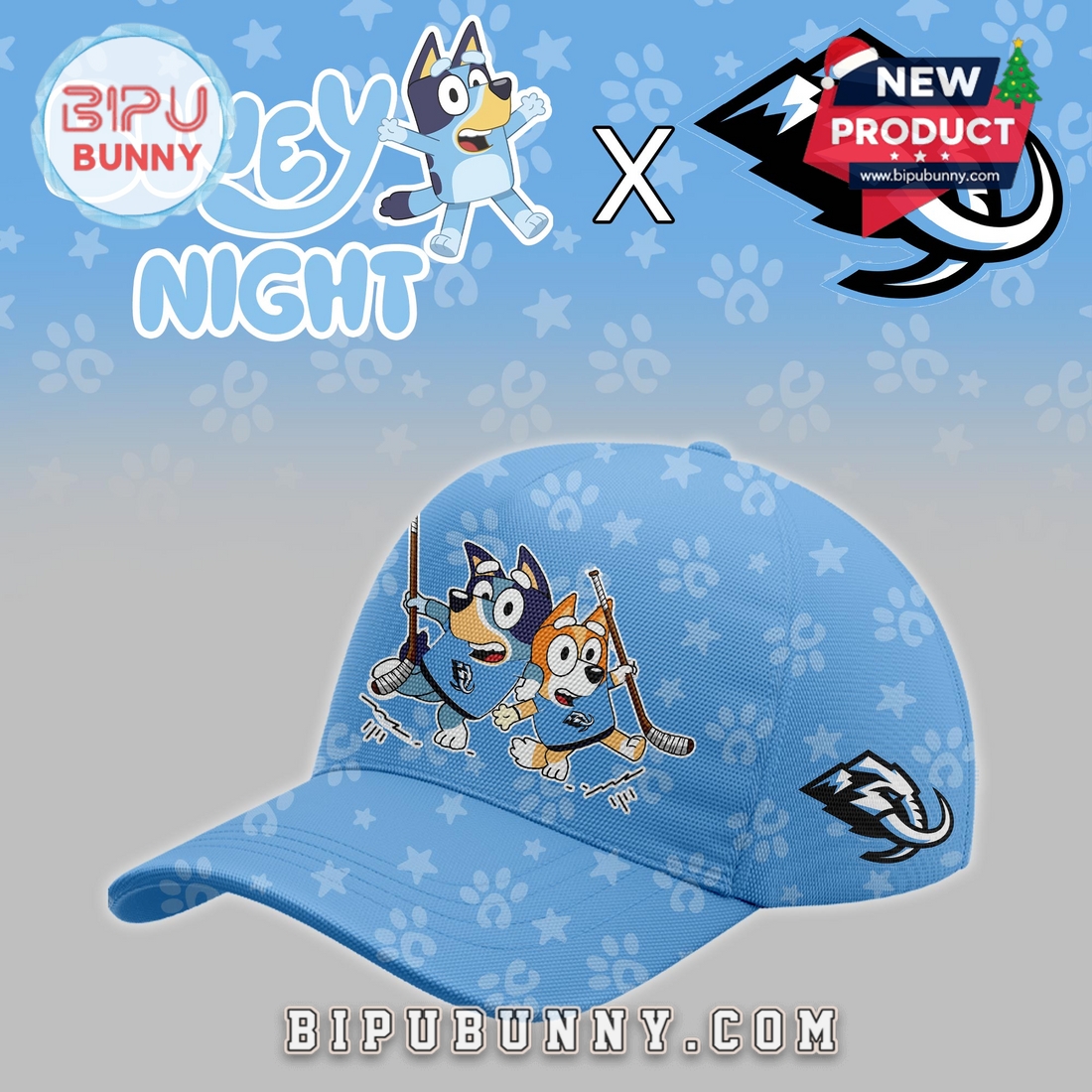 Centered on the chest is the Utah Mammoth team logo, sharp and clearly defined against a background filled with small paw prints and star patterns that add subtle texture across the jersey. Near the waistline, Bluey and Bingo appear dressed in hockey outfits, illustrated in playful skating poses that give the jersey personality without overpowering the team branding. The sleeves include a black zigzag ice trim detail, creating contrast between the light blue and white sections. On the back, a large Bluey themed lettering graphic spans the shoulders, filled with friendly character art that looks just as good from behind as it does from the front. Some editions also include a matching cap, featuring the same colors, paw print pattern, and Bluey hockey artwork, making it easy to complete the look. The main benefit is a jersey that feels comfortable, visually fun, and unique among standard NHL apparel.
