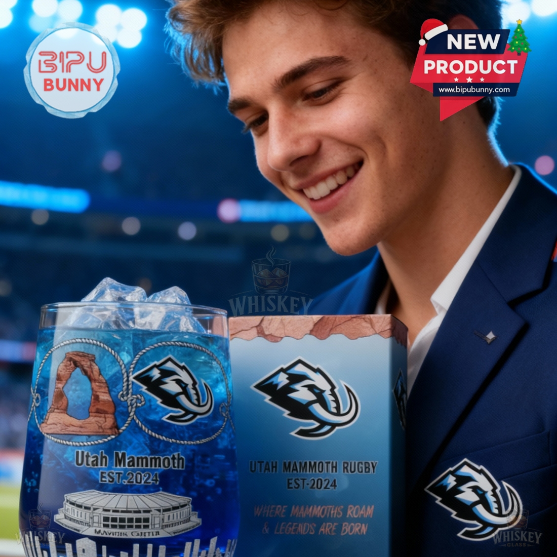 The Utah Mammoth Rugby Whiskey Glass is a bold new piece of fan merchandise designed to capture the spirit of one of the most exciting new rugby teams in the country. This glass is made from high-grade transparent glass with a solid, heavy base that provides excellent balance and a satisfying weight in the hand. What sets it apart immediately is the deep arctic blue gradient that wraps around the lower portion of the glass, giving the appearance of icy depth and movement when filled.