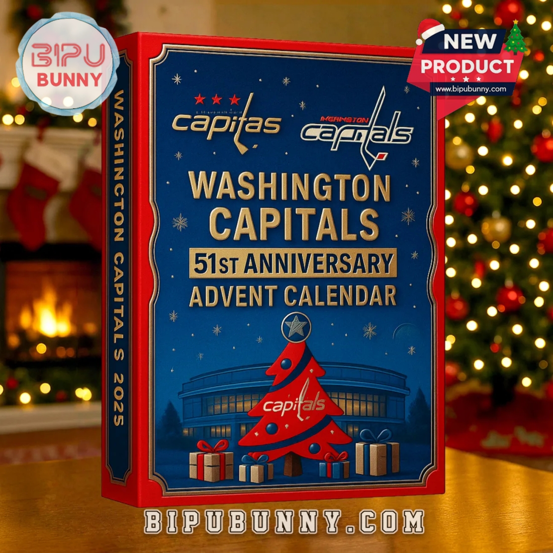 The Washington Capitals 51st Anniversary Advent Calendar is a collectible masterpiece that honors over five decades of unforgettable hockey moments. Designed with the team’s signature red, navy, and white color palette, this 2025 edition is both a holiday keepsake and a tribute to Capitals pride. The box is decorated with snowflakes, gold accents, and a bold image of Capital One Arena, paired with the team’s wordmark and a red Christmas tree illustration topped with a star. The details extend down to the smallest touches—tiny wrapped gifts, miniature sticks, and even the number “51” emblem marking the anniversary years from 1974 to 2025.