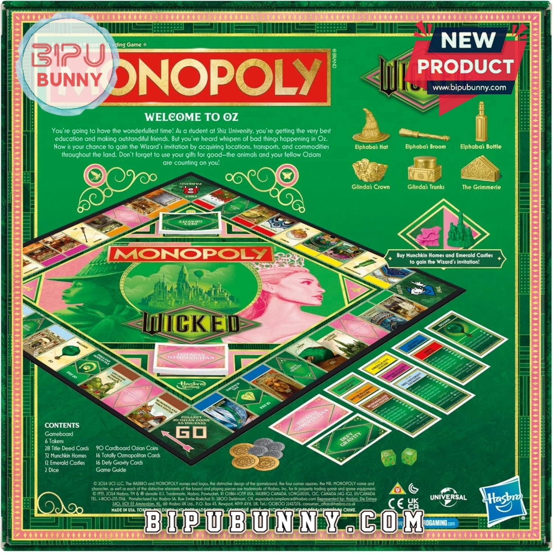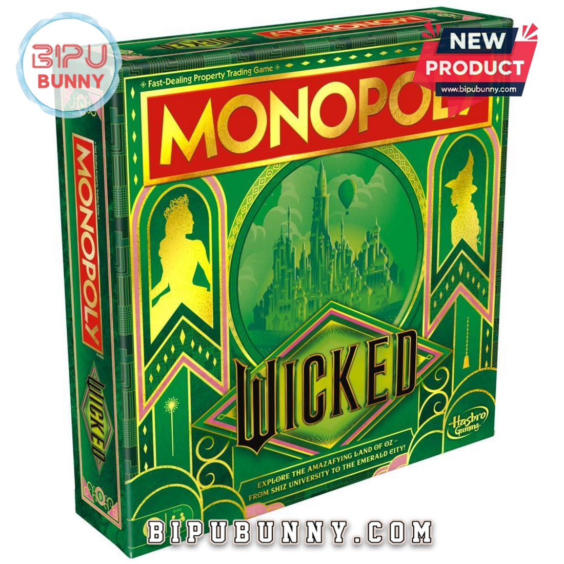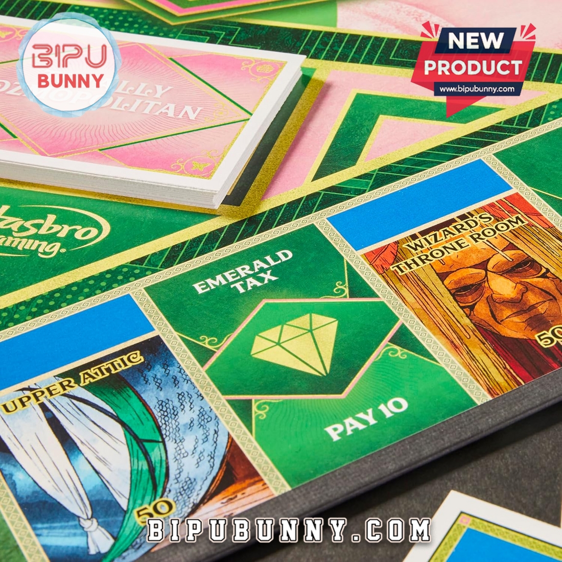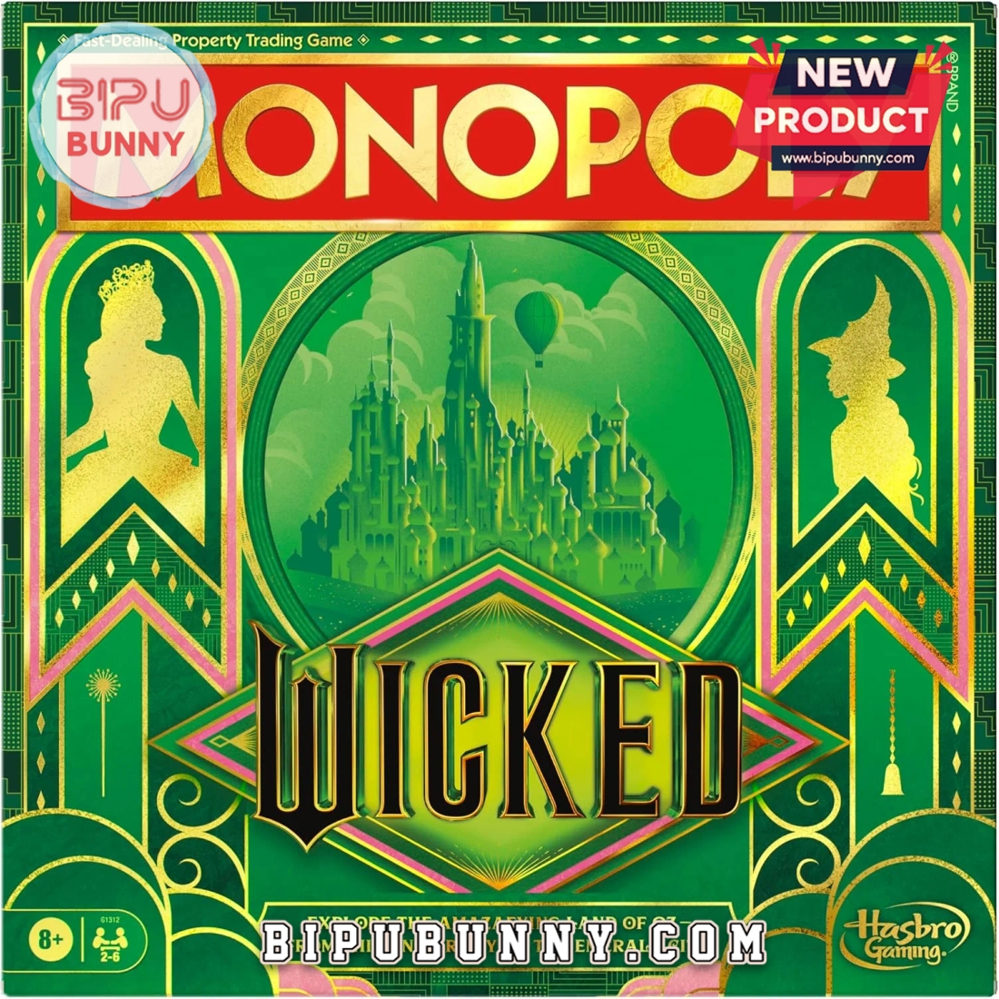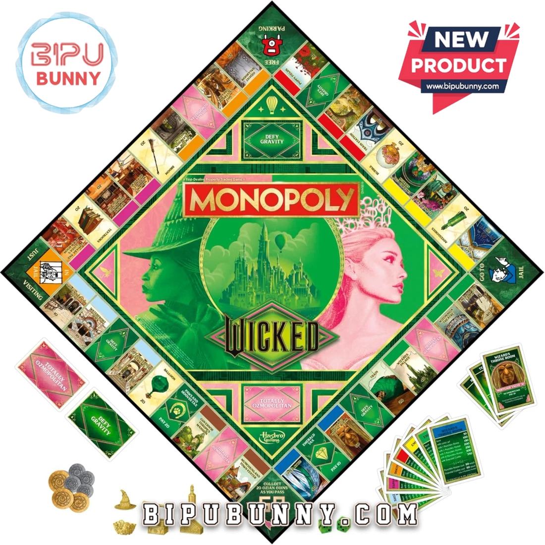 The Wicked Monopoly Board Game is an exciting twist on the classic Monopoly that brings the magic of Oz to life! The board features a vibrant green and gold color scheme that immediately catches the eye, creating a magical and immersive experience. The game pieces, such as the Witch’s Hat, Broom, and Emerald Crystal, are designed with bold, whimsical colors like pink and green to reflect the world of Oz. The property spaces represent iconic locations from the musical, including the Emerald City, Wizomania Theatre, and Shiz University, making the game even more enchanting. Chance cards and property cards are filled with references to the magical universe of Wicked, with playful touches such as Emerald Tax and unique rewards. All of these details come together to create a unique gaming experience that combines traditional Monopoly rules with a fun Wicked theme.